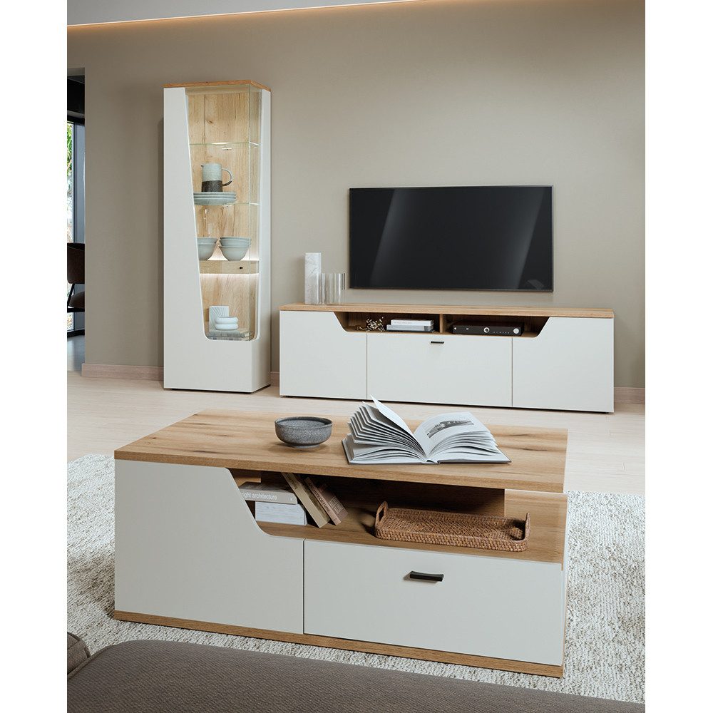 Dein Wohnzimmer in moderner Ruhe: Das Set aus Vitrine, Lowboard und Couchtisch verbindet kaschmirfarbene Fronten mit warmer Eiche.