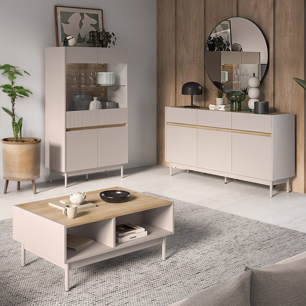 Setz dein Wohnzimmer gekonnt in Szene mit diesem stilvollen Set in kaschmir matt und Akzenten in Eiche-Dekor. Das moderne Design überzeugt mit grifflosen Fronten, feiner Rillenoptik und eleganten Metallfüßen. Highlight ist das Highboard mit Glaseinlegeboden und integrierten LED-Unterbauspots, die deine Lieblingsstücke in stimmungsvollem Licht erstrahlen lassen. Ergänzt wird das Set durch einen funktionalen Couchtisch mit offenen Fächern und ein geräumiges Sideboard mit Softclose-Türen und Vollauszügen.
