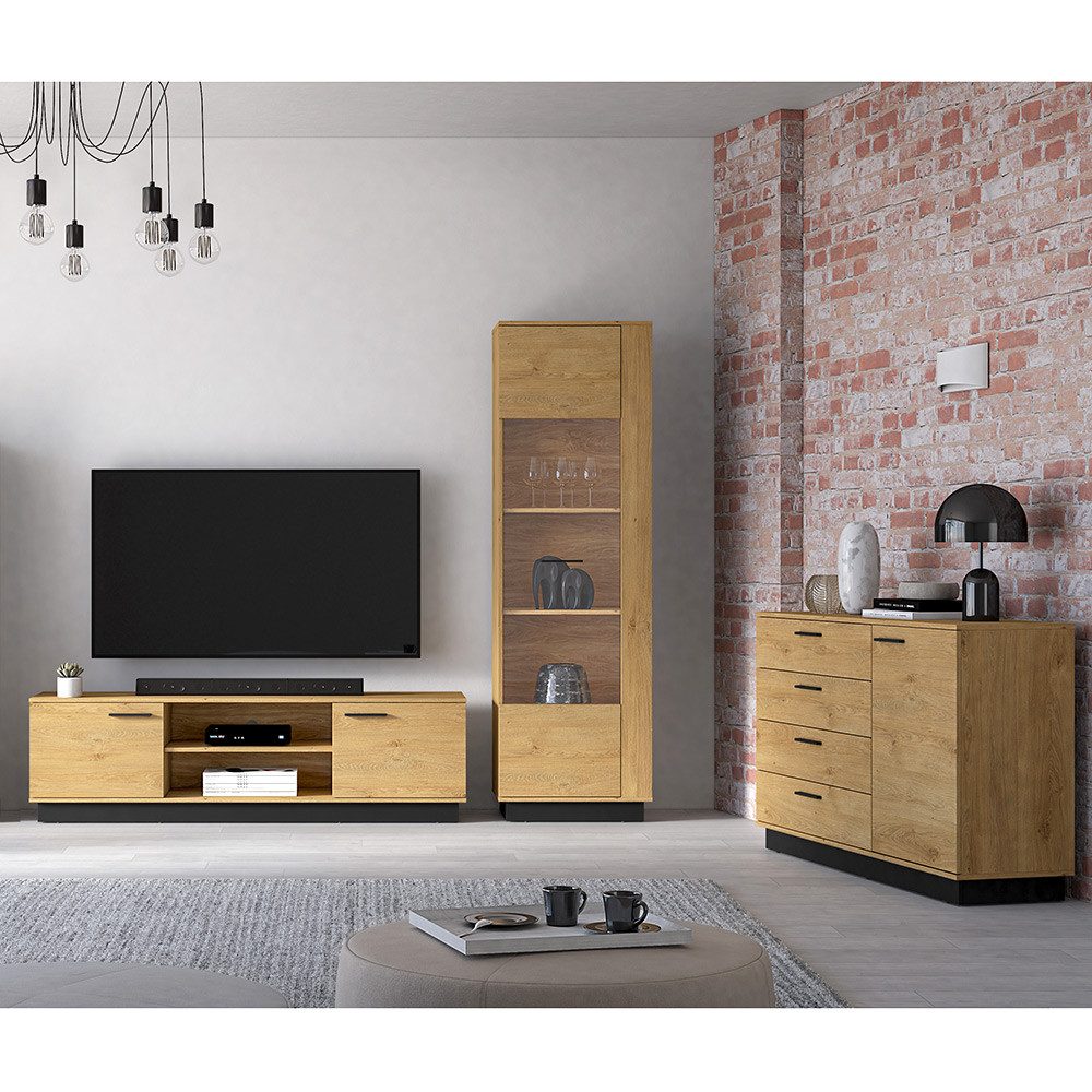 Diese ausdrucksstarken Möbel bringen urbanen Charakter und wohnliche Wärme in Dein Zuhause. Das Set aus Vitrine, Lowboard und Kommode vereint kraftvolles Holzdekor mit markanten schwarzen Akzenten. Die klare Formensprache und großzügigen Stauraumlösungen schaffen Ordnung mit Stil. Ob für Technik, Geschirr oder Lieblingsstücke – hier findet alles seinen Platz. Ein klares Statement für moderne Wohnräume mit Charakter.