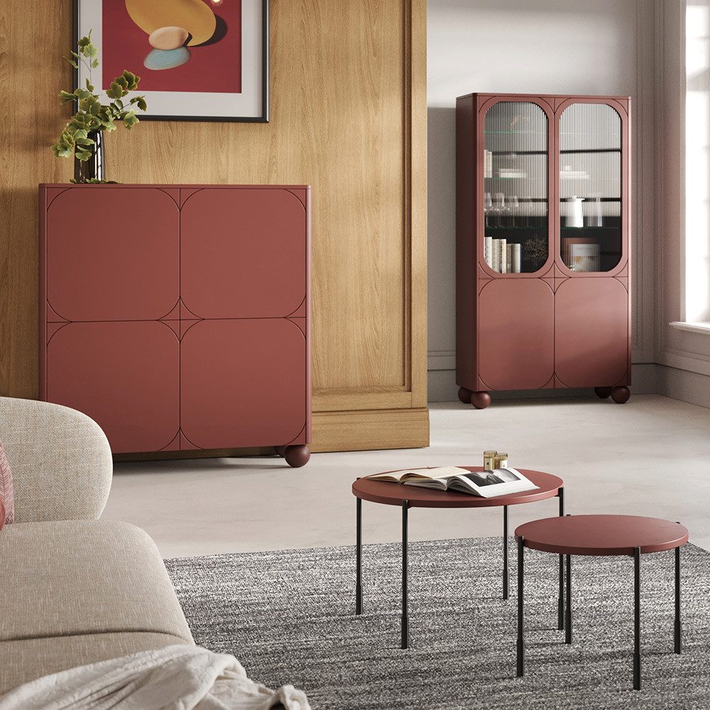 In modernem Burgunderrot matt bringt dieses Wohnzimmer-Set Eleganz und Charakter in dein Zuhause. Die grifflose Gestaltung mit Push-to-open und Softclose sorgt für höchsten Bedienkomfort, während farblich passende Kugelfüße aus Massivholz und die schwarze Innenoptik stilvolle Akzente setzen. Das Set besteht aus einem Vitrinenschrank mit Ornamentglastüren und variablen Böden, einem Highboard mit Türen, Schubladen und flexiblen Stauraumlösungen sowie zwei runden Beistelltischen in 64 cm und 49 cm Durchmesser. Dank pflegeleichter, unempfindlicher Oberflächen bleibt das Ensemble robust und dauerhaft schön.