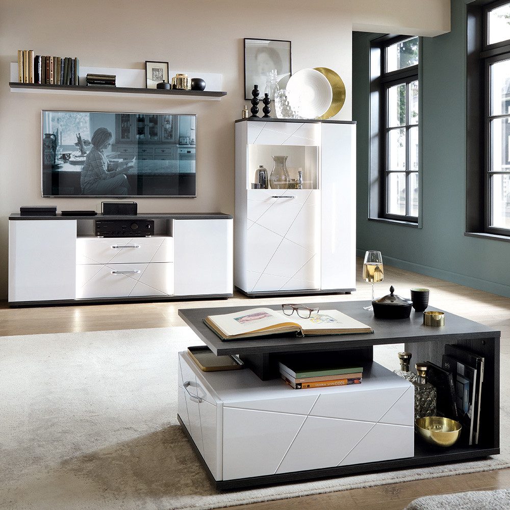 Veredle dein Wohn- und Esszimmer mit unserer modernen Möbelkollektion in Weiß Hochglanz und Vicenza Eiche Schwarz.
