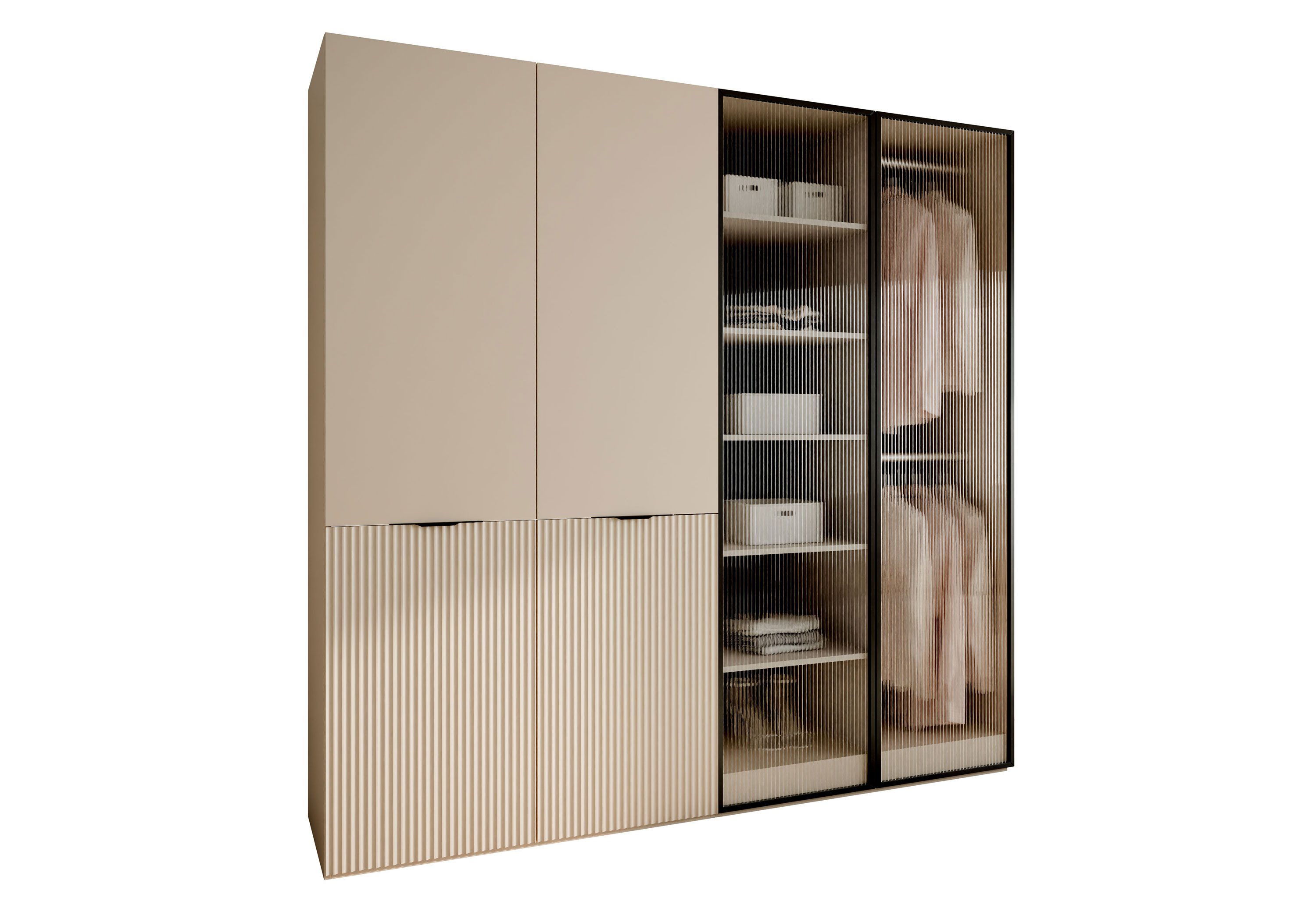 Ein besonderes Merkmal des Schranks SANDBOX ist die Möglichkeit, die Fronten an den Einrichtungsstil anzupassen. Die Variante mit vollständigen Türen sorgt für Diskretion und harmonisches Design, während die teilweise verglaste Front den Inhalt dezent zur Schau stellt und dem Möbelstück Leichtigkeit verleiht. Beide Varianten sind in verschiedenen Ausführungen erhältlich, sodass sich der Schrank perfekt an Ihre persönliche Ästhetik anpassen lässt.