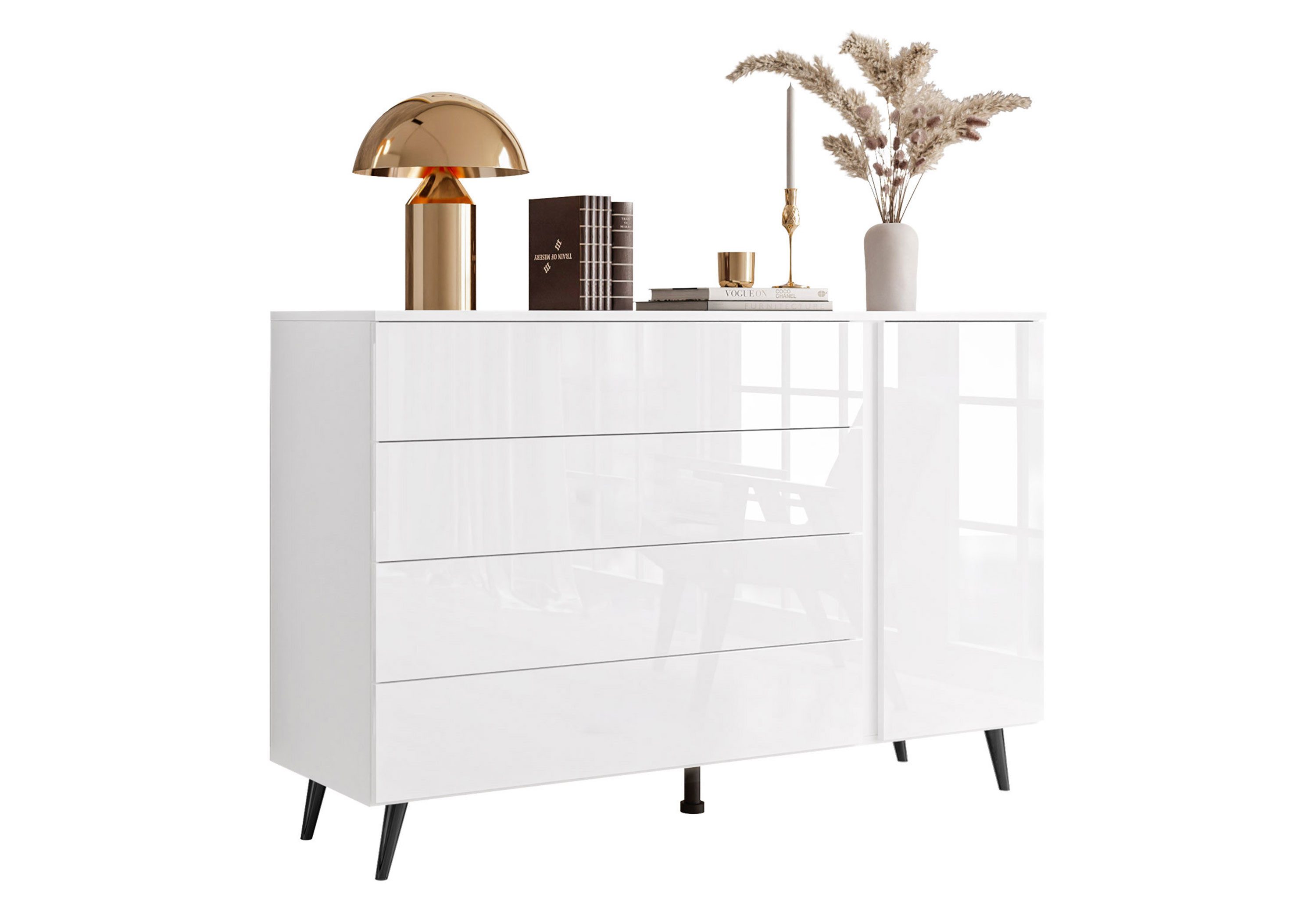 Die Kommode ist aus hochwertigen Materialien gefertigt, die sich durch ihre Langlebigkeit und Widerstandsfähigkeit auszeichnen. Die Fronten der Kommode sind aus einer Acrylplatte gefertigt, die der Oberfläche einen Hochglanzeffekt verleiht.