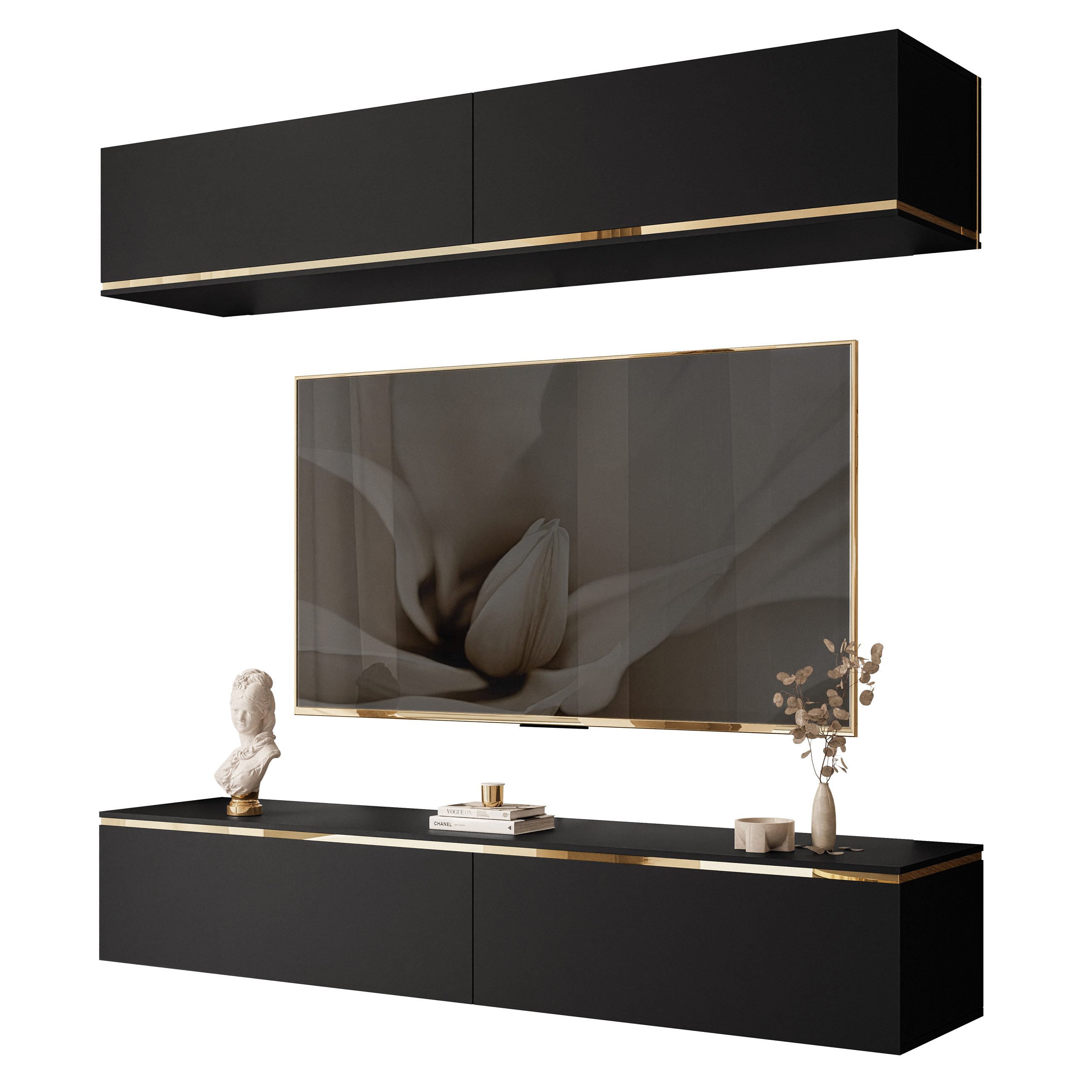 Die modische Schwarz Färbung verleiht dem Schrank Subtilität und Eleganz. So fügt er sich harmonisch in eine Vielzahl von Inneneinrichtungen ein, von modern bis klassisch. Der goldene Streifen rund um den Schrank setzt einen zarten Akzent, der ins Auge fällt und den exklusiven Charakter des Schranks unterstreicht.