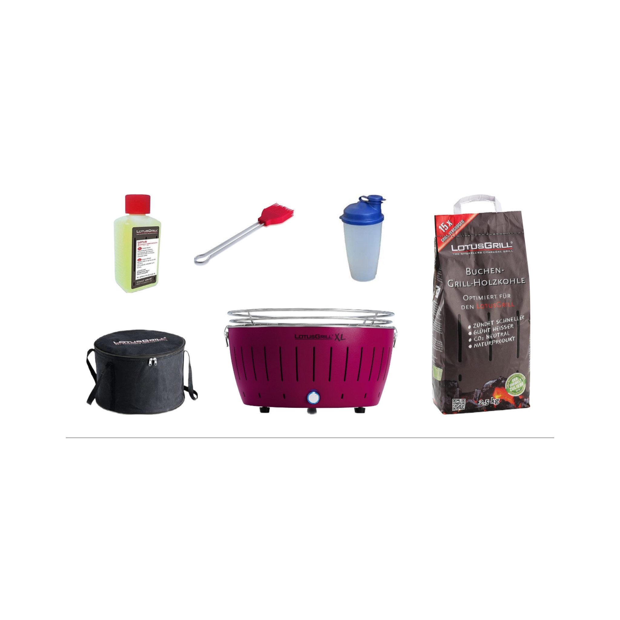 Lieferumfang: 1x LotusGrill, 1x LotusGrill Tragetasche, 1x Buchenholzkohle 2,5 kg, 1x Brennpaste 200ml, 1x Marinierpinsel (Farbe nach Vorrat), 1x Dressingshaker, 4 x Mignon Batterien, 1x Gebrauchsanweisung
