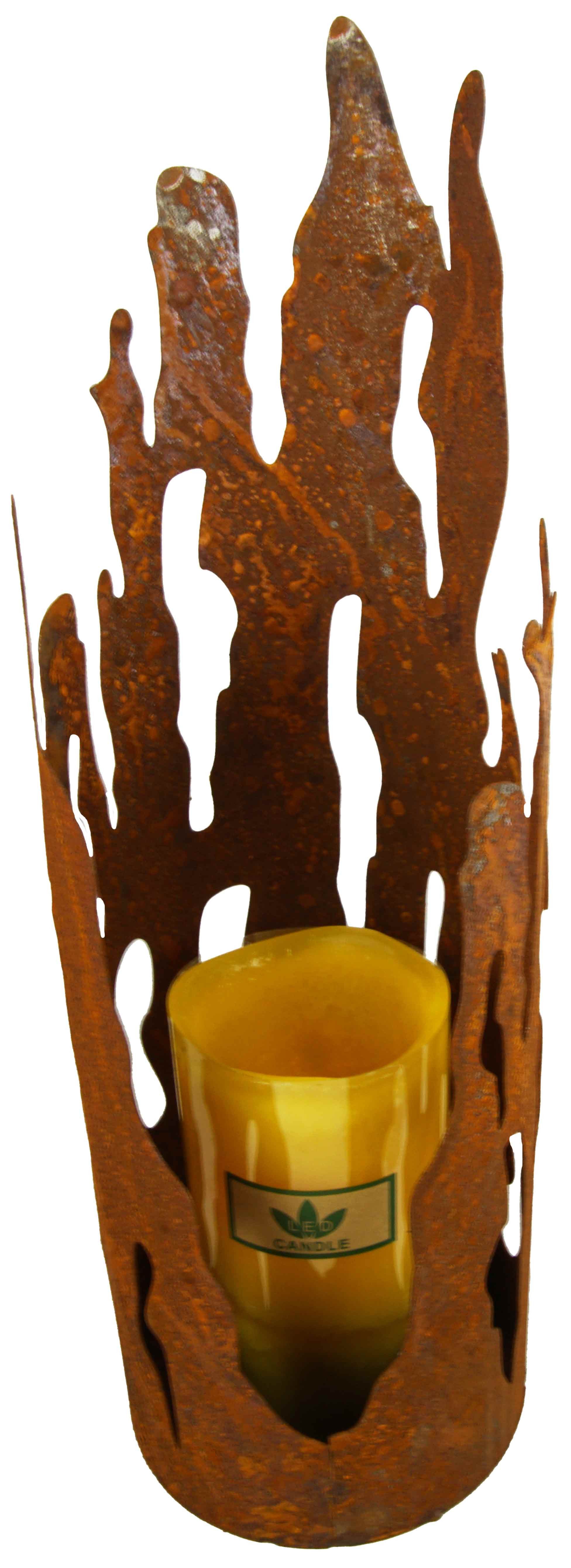 Dieses bezaubernde Windlicht für den Garten besticht durch sein einzigartiges Flammendesign und eine rostige Optik, die einen rustikalen Charme im Freien verbreitet. Die Flammenoptik zaubert ein warmes Licht, das eine gemütliche Atmosphäre schafft und den Garten in ein behagliches Ambiente taucht. Ein stilvolles Accessoire, dass Ihrem Außenbereich eine zeitlose Eleganz verleiht, romantische Abende im Freien verschönert und dem Außenbereich eine zeitlose Eleganz gibt. LED Kerze nicht im Lieferumfang enthalten. Abmessungen ca.: Gesamthöhe: 40 cm Gesamtdurchmesser: 13 cm Material: Metall im Rostdesign
