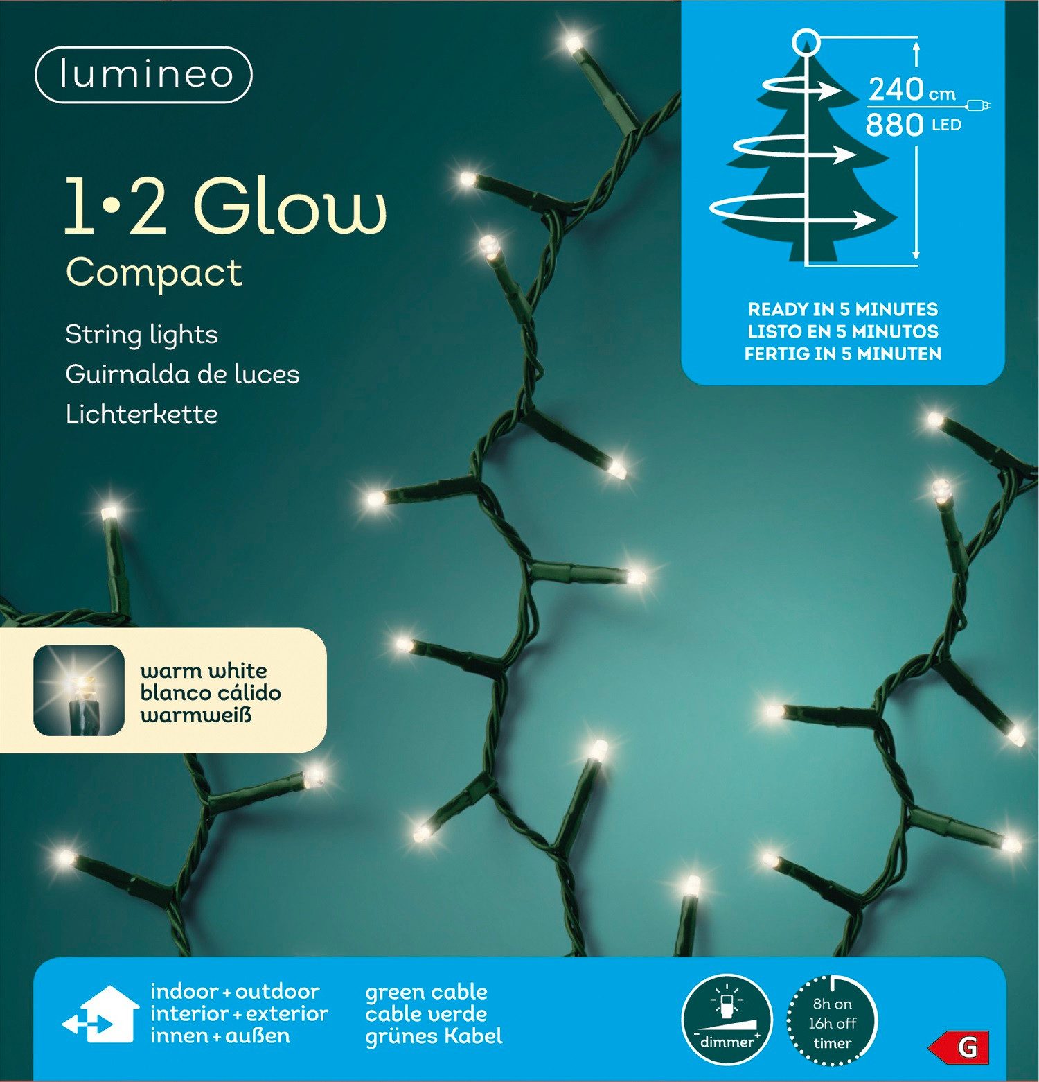 Die Lichterkette verfügt über 880 LEDs die in einem warm weißen Ton erstrahlt. Das grüne Kabel fügt sich nahtlos in den Weihnachtsbaum ein und lässt die Lichter in voller Pracht erstrahlen. Die Beleuchtung ist für Weihnachtsbäume bis zu einer Höhe von 2,4 m geeignet. Die LEDs sind auf 8 Strängen mit folgenden Längen aufgeteilt: 4,5 m, 4 m, 3,5 m, 3 m, 2,5 m, 2 m, 1,5 m und 1 m. Befestigt wird sie mit einem Gummi-Ring oben am Baum. Die Dimm-Funktion ermöglicht es, die Helligkeit nach Belieben in 5 unterschiedlichen Stufen anzupassen. Dank der praktischen Timer-Funktion lässt sich die Lichterkette ganz bequem steuern, sodass sie automatisch 8 Stunden lang eingeschaltet und 16 Stunden ausgeschaltet ist. Diese Funktion spart nicht nur Energie, sondern sorgt auch dafür, dass die Lichterkette jeden Tag zur gleichen Zeit erstrahlt. Die Beleuchtung bietet zudem eine großzügige 5 m lange Zuleitung, wodurch die LED-Kette eine Gesamtlänge von 7,4 m besitzt. Mit dem IP44-Schutz ist sie Wetterbeständig und somit gegen Spritzwasser geschützt. Sie ist für den Innen- und Außenbereich geeignet.