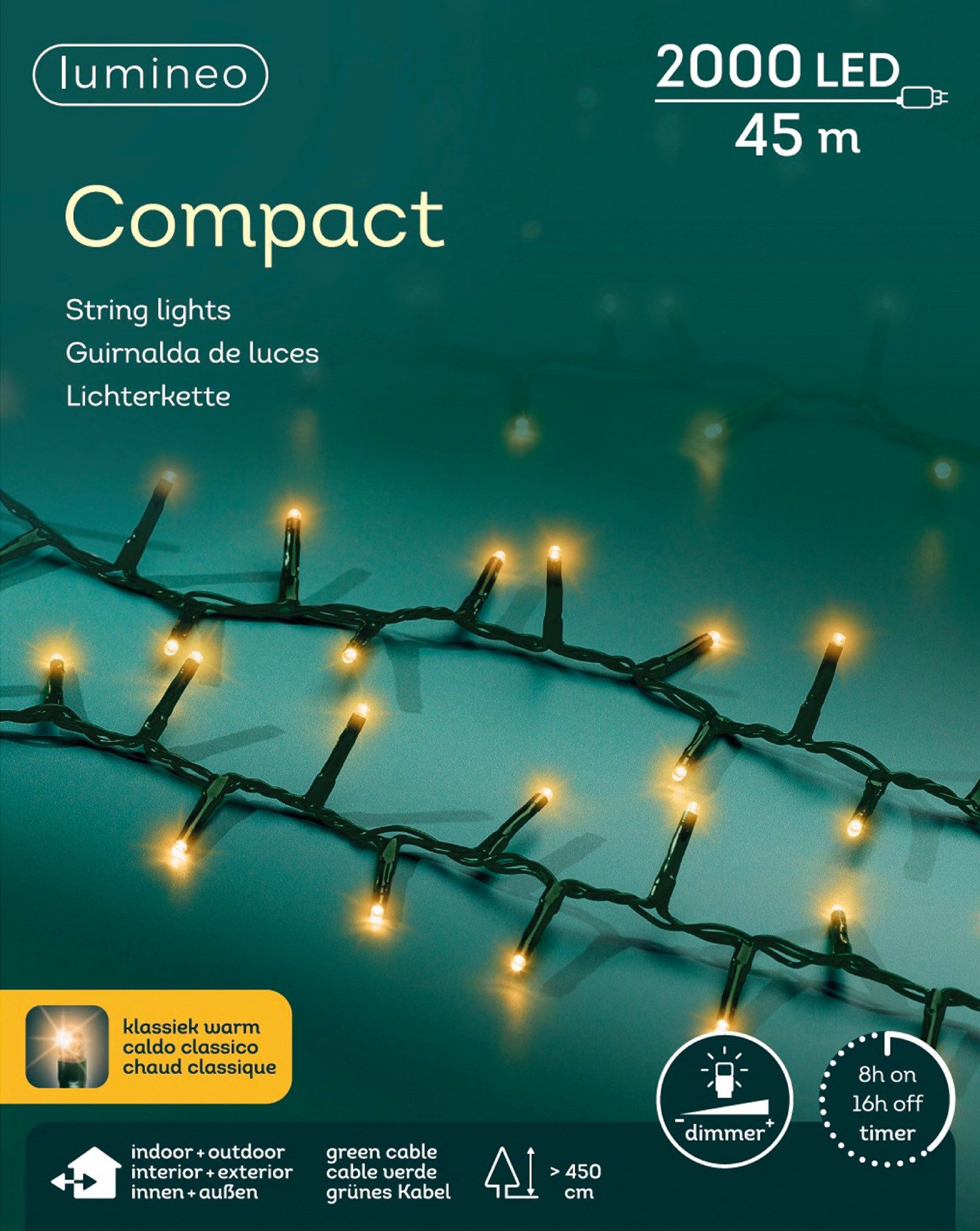 Die Lichterkette verfügt über 2.000 LEDs, welche in einem klassisch warmen Ton erstrahlen. Die 5 Stufen-Dimm-Funktion ermöglicht es, die Helligkeit nach Belieben anzupassen und somit die perfekte Atmosphäre zu schaffen. Dank der praktischen Timer-Funktion lässt sich die Lichterkette ganz bequem steuern, sodass sie automatisch 8 Stunden lang eingeschaltet und 16 Stunden ausgeschaltet ist. Diese Funktion spart nicht nur Energie, sondern sorgt auch dafür, dass die Lichterkette jeden Tag zur gleichen Zeit erstrahlt. Die Beleuchtung bietet zudem eine zusätzliche 5 m lange Zuleitung, wodurch die Lichterkette eine Gesamtlänge von 50 m besitzt. Mit dem IP44-Schutz ist sie Wetterbeständig und somit gegen Spritzwasser geschützt. Sie ist für den Innen- und Außenbereich geeignet. Für eine Baumhöhe von > 450 cm geeignet. Mit Gütesiegel ausgezeichnet. Das Kabel ist grün.