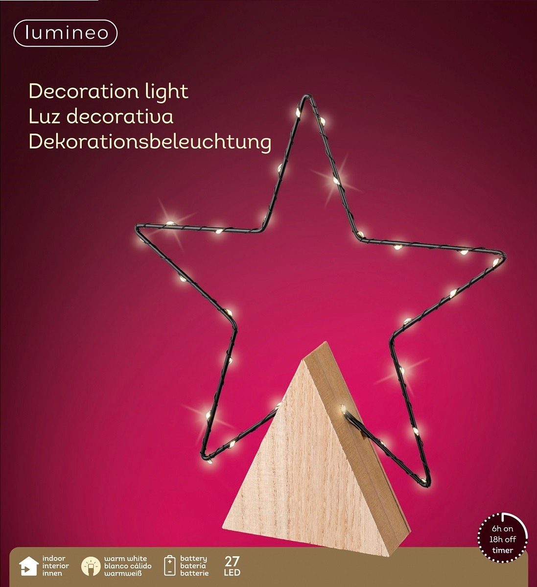 Der LED Stern ist auf einem Holzständer aufgestellt und verfügt über 27 warm weiße Micro LEDs. Dank der praktischen Timer-Funktion lässt sich die Lichterkette ganz bequem steuern, sodass sie automatisch 6 Stunden lang eingeschaltet und 18 Stunden ausgeschaltet ist. Diese Funktion spart nicht nur Energie, sondern sorgt auch dafür, dass die Lichterkette jeden Tag zur gleichen Zeit erstrahlt. Die Beleuchtung wird mit 2 Batterien betrieben (nicht im Lieferumfang enthalten). Nur für den Innenbereich geeignet.