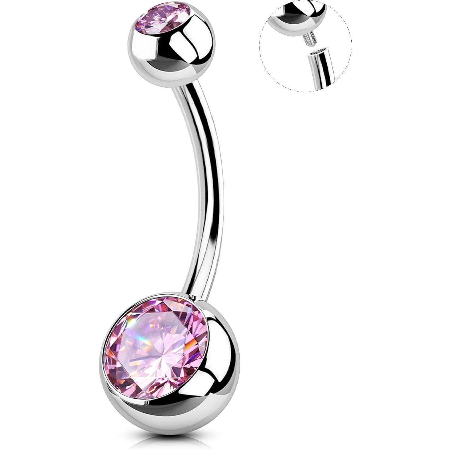 Der Bauchstab hat eine Bar-Stärke von 14G/1.6mm und ist in verschiedenen Längen von 10mm bis 16mm erhältlich - so finden Sie garantiert die passende Größe. Die obere Kugel hat einen Durchmesser von 5mm, während die untere 8mm misst und mit einem funkelnden pinkfarbenen CZ-Stein verziert ist, der für einen Hauch von Farbe sorgt und das Design elegant abrundet.