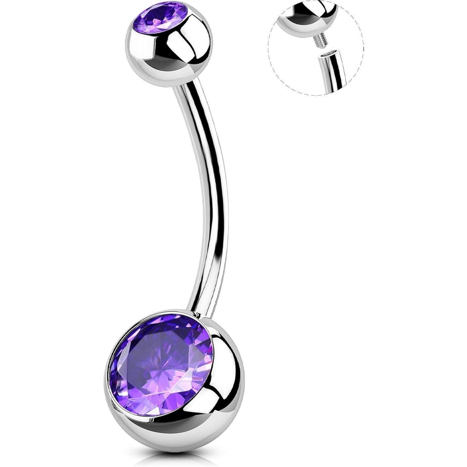This belly button ring is a stunning piece of navel jewelry that enhances your style effortlessly. The purple cubic zirconia adds a pop of color and sparkle to your belly button piercing, making it eye-catching and unique. The internally threaded design of the belly button bar makes it easy to wear, ensuring a smooth and comfortable experience.