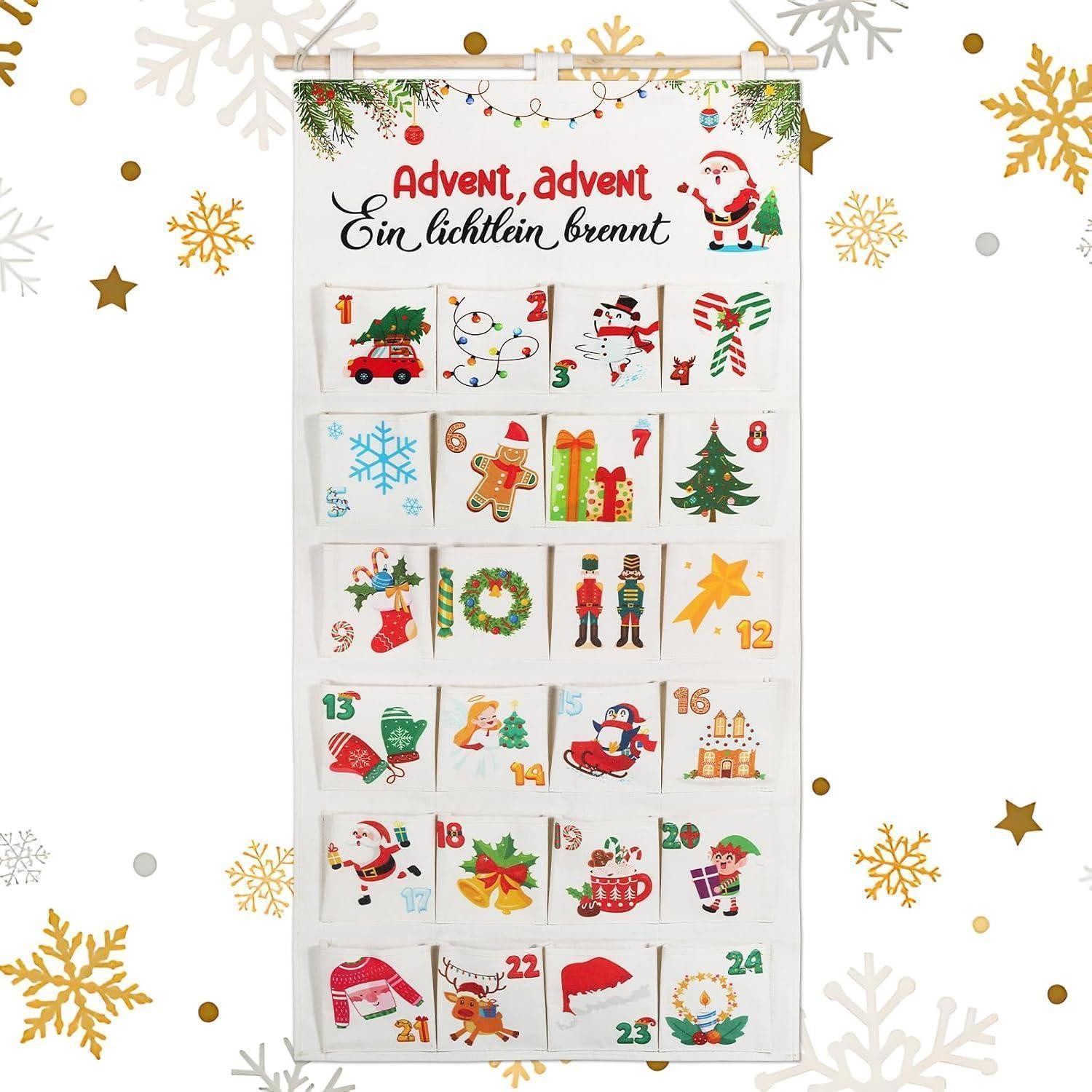 Stell dir vor: Der Advent wird zur warmen Lichtzeit in deinem Zuhause. Der Adventskalender 2025 Wandkalender Bunteweiß-Advent Ein Lichlein Brennt begleitet dich durch die Vorweihnachtszeit. In 100 x 50 cm groß präsentiert er sich als filigraner Blickfang an Wand, Tür oder Dekoleiter – robust, aus Stoff und bereit, jeden Tag ein neues, kleines Wunder zu enthüllen. Mit 24 Fächern für kleine Überraschungen und 11 x 11 cm großen Taschen findet jede kleine Freude ihren Platz. Der Kalender ist aus Stoff, langlebig und nicht leicht gebrochen – damit du ihn viele Jahre verwenden kannst. Paket beinhaltet: Bunt Adventskalender als Wandkalender 2025 zum Befüllen, eine Holz-Halterung zum Aufhängen und Hanfseil.