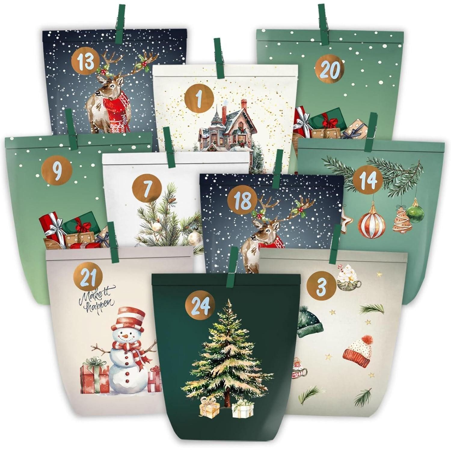 Stell dir vor: Die Vorweihnachtszeit wird zu einem kreativen Countdown, der dich jeden Tag aufs Neue begeistert. Mit dem Adventskalender in Aquarell Grün gestaltest du 24 liebevoll befüllbare Adventstüten, die deine Familie zusammenbringen und jedes Türchen zu einem kleinen Fest werden lassen. Dieses selbstbefüllbare Set ist mehr als Dekoration – es ist ein Erlebnis.