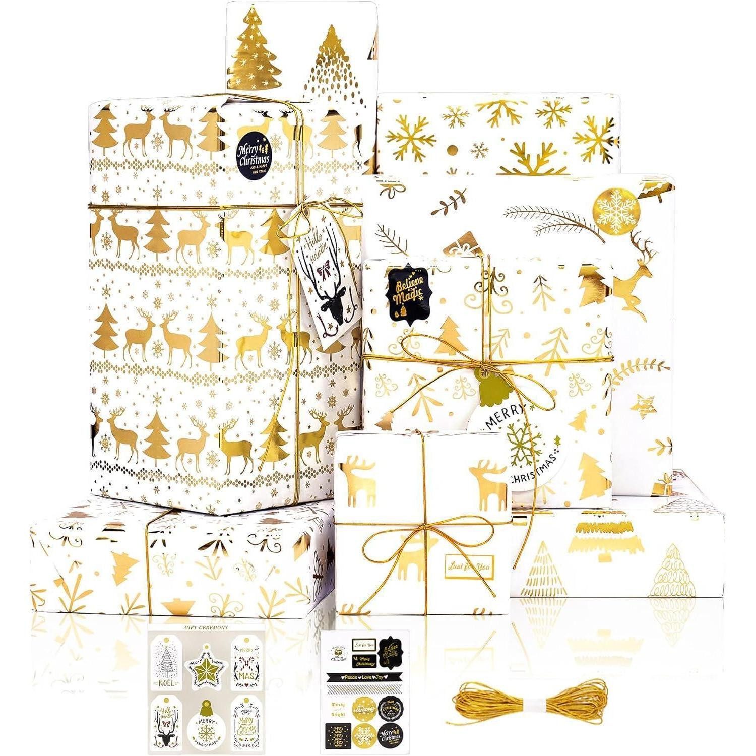 Dieses Set verwandelt jedes Geschenk in ein elegantes Kunstwerk. Die Kombination aus hochwertigem Papier, dem klaren Muster und dem funkelnden Gold veredelt Präsente für Weihnachten, Geburtstage, Hochzeiten, Jubiläen, Taufen und mehr. Die 70 x 50 cm großen Bögen bieten großzügige Gestaltungsmöglichkeiten, und die Glitzer-Aufkleber sowie die Geschenkanhänger setzen farblich passende Akzente. Mit der 12 Meter langen Geschenkband-Rolle hast du zudem alles griffbereit, um deine Kreationen schnell und professionell abzuschließen. Perfekt für Neujahr, Feiertage und jeden, der seinen Geschenken eine unvergessliche Note geben möchte.SEO-Keywords: Larcenciel Geschenkpapier Weihnachten Set, 6 Bögen Metallic Glitzer Weihnachtsgeschenkpapier Gold, Eleganter Weihnachtsbaum Schneeflocke Elch Weihnachtspapier für Neujahr, Ferien, Geburtstage, 70x50cm Weiß-goldenes Weihnachtsgeschenkpapier.