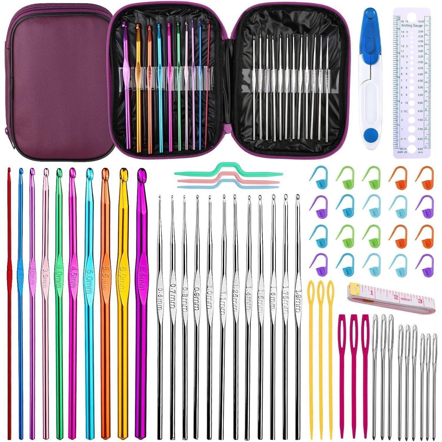 Smooth Crochet Complete Set: Der Haken gleitet leicht und vermeidet das Hängenbleiben von Trennfäden. Dieser polierte Aluminiumhaken ist perfekt geformt für glattes Häkeln. 10 Stück mehrfarbige Aluminium-Häkelnadeln, die Größe beträgt 2 mm bis 6,5 mm, 12 Stück Edelstahl-Stricknadeln, die Größe beträgt 0,6 mm bis 1,9 mm. Ein komplettes Häkelnadel-Set kann Ihre unterschiedlichen Bedürfnisse beim Häkeln erfüllen.