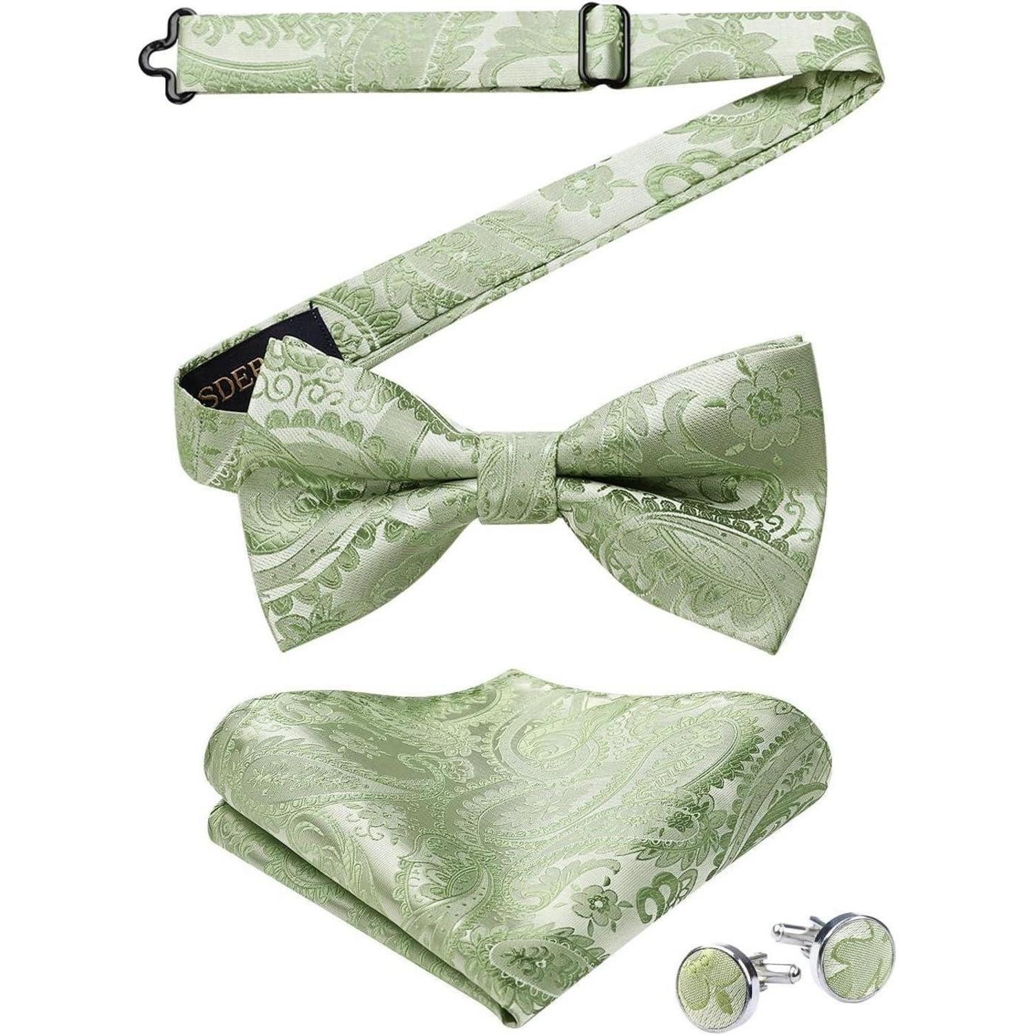 Stell dir vor: Du trittst mit Stil auf – dieses Set aus einer Paisley-Fliege, dem passenden Einstecktuch und zwei Manschettenknöpfen in A-salbei Grün begleitet dich bei jedem Anlass. Die vorgebundene Fliege mit verstellbarem Kragen ist einfach zu tragen und sitzt in Sekunden perfekt, egal ob Hochzeit, Business oder Festlichkeit.