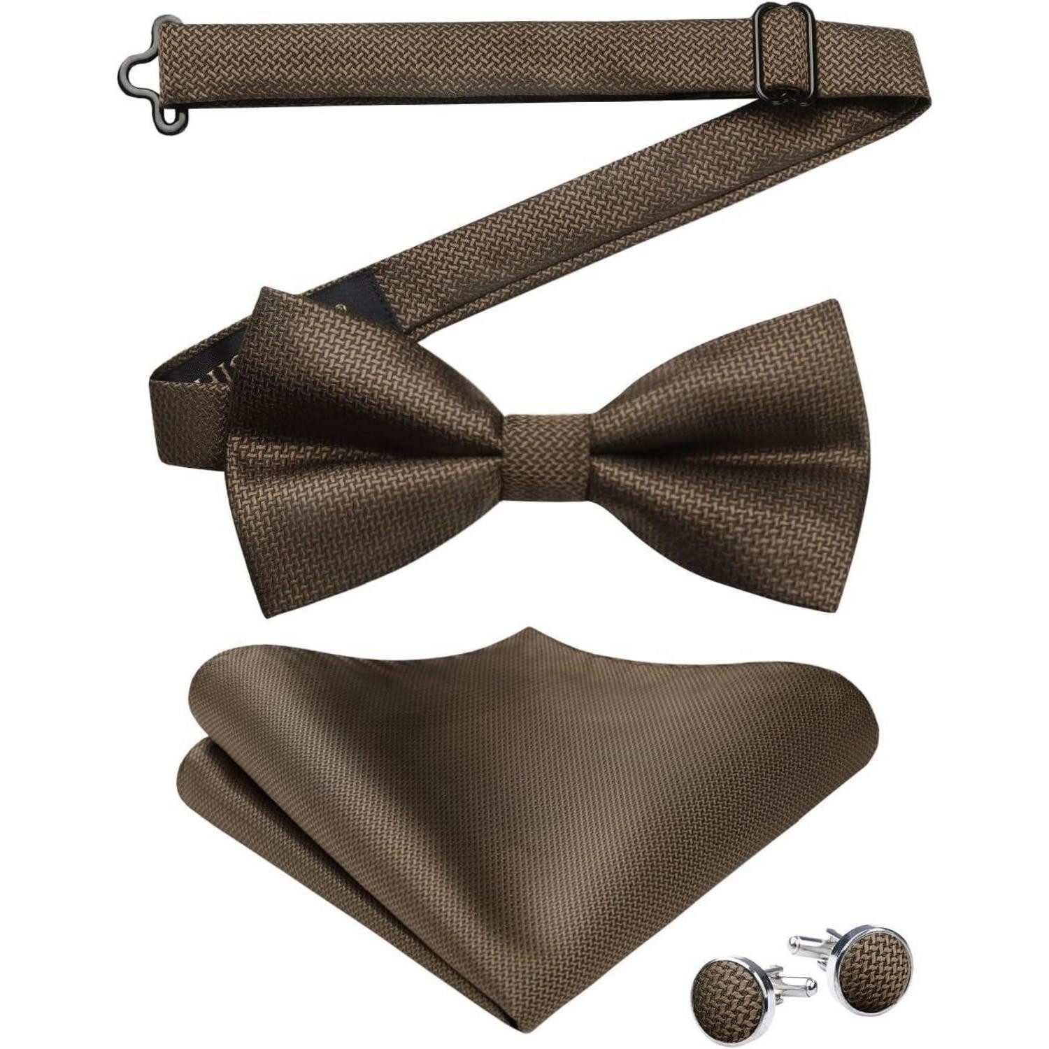 Dieses Set erzählt eine kurze, aber überzeugende Geschichte: Die weiche Textur aus Seide und Polyester gleitet angenehm über die Haut, während das Doppelschicht-Design dem Look eine subtile Tiefe verleiht. Die vorgebundene Fliege mit verstellbarem Kragen sorgt dafür, dass du sofort perfekt aussiehst, ohne Zeit mit Binden zu verlieren. Egal, ob Hochzeit, Büro, Festtagsempfang oder Abendessen – A2 Braun ist dein zuverlässiger Stil-Partner. Kombiniere es mit passenden Hemden und Accessoires und setze gezielt Akzente mit dem Einstecktuch und den Manschettenknöpfen, um einen durchgängigen, edlen Look zu schaffen.