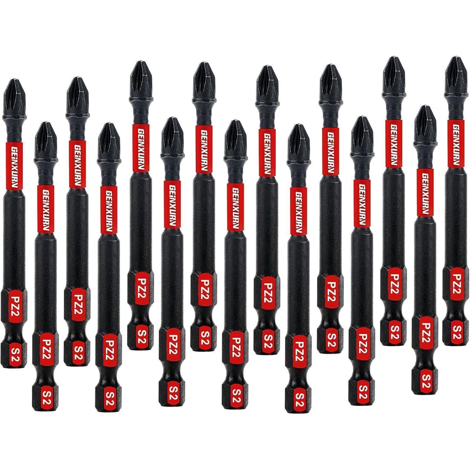 SEO-Keywords: Geinxurn 15 Stück PZ2 Schrauber Bits Set 75mm Länge #2 Pozidriv Schlagfester Bitsatz, 1/4 zoll Sechskantschaft S2 Legierter Stahl Magnetische Pozidriv PZ2 75mm 15Stück