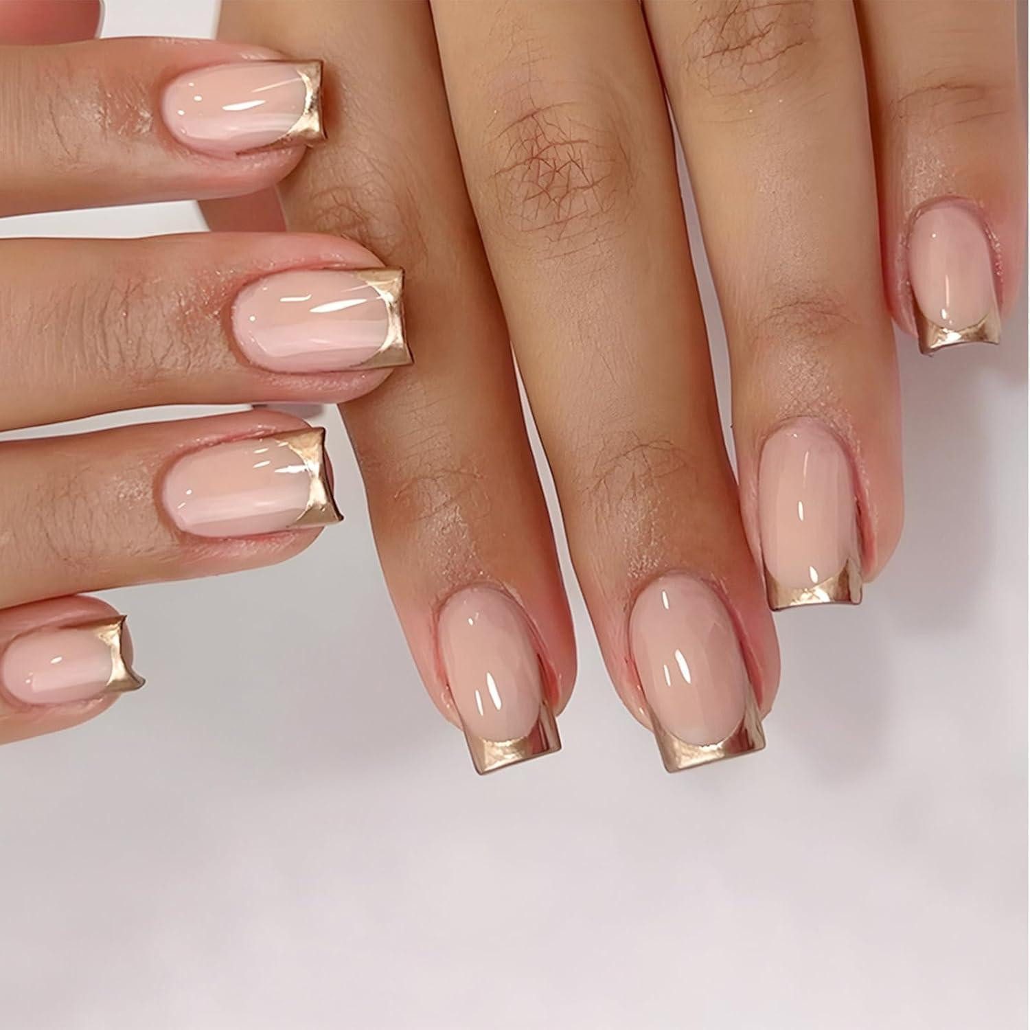 Goldfarbene Französische Press-On Nägel in mittlerer Größe bieten Vollabdeckung und werden mit Gelkleber und Nagelfeile geliefert