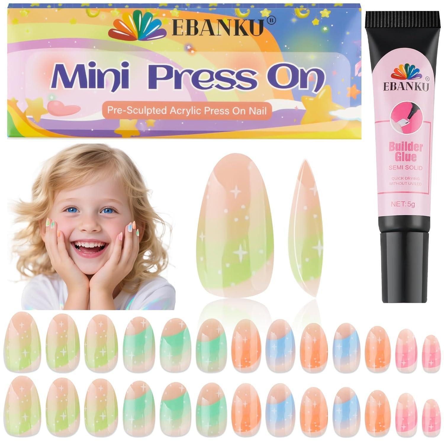 Die Nagelkunst beginnt ganz einfach: Wähle die passende Größe, klebe sie fest (ohne UV-Licht), feile sie in Form und genieße das Ergebnis. Dieses Set ist perfekt für DIY-Nagelkunst, macht jedem Mädchen Spaß und ist eine tolle Geschenkidee – ob Geburtstag oder Weihnachten; die 26 Stücke sind bereit, geteilt zu werden, damit Familie und Freunde gemeinsam Spaß haben. EBANKU 1 Pack Kind Falscher Nagel, 26 Stück Presse auf Nägel Kinder Garish Presse auf Nagel kurze künstliche falsche Nägel Kits für Mädchen Grelle Farben.