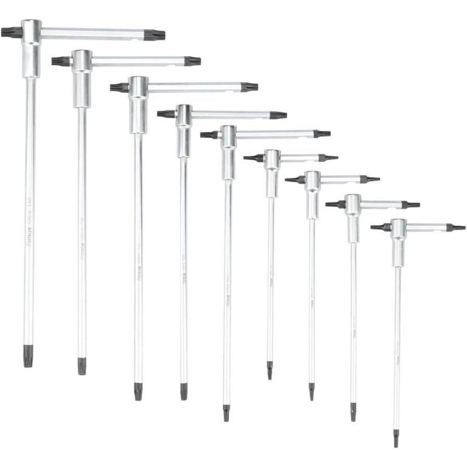 Der 9‑teilige Torx‑Schlüsselsatz deckt das komplette Spektrum von T8 bis T40 ab und eignet sich für Automobil‑ und Elektronikschrauben