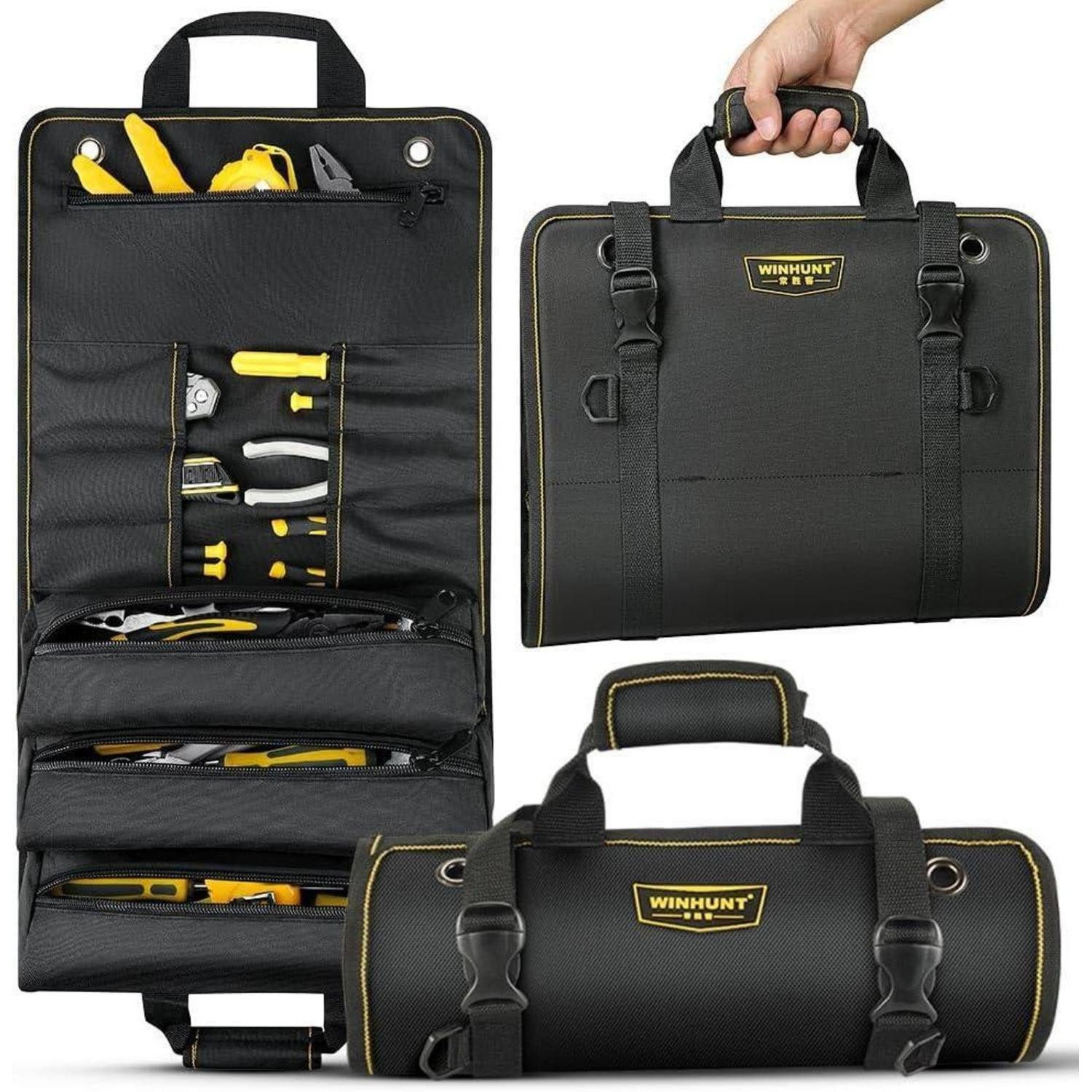 Stell dir vor, du greifst in die WINHUNT Werkzeugrolle und findest sofort, was du brauchst. Die Werkzeugtasche 11 Taschen Werkzeug Rolltasche 68cm x 36cm begleitet dich von der Werkstatt zur Baustelle und zurück – zuverlässig, strukturiert und immer bereit. Ob du Heimwerker, Elektriker, Tischler oder Mechaniker bist, mit den 11 Pockets behältst du jeden Einsatz im Griff. Diese Rolle ist mehr als eine Tasche – sie ist dein kompletter Begleiter für effizientes Arbeiten.