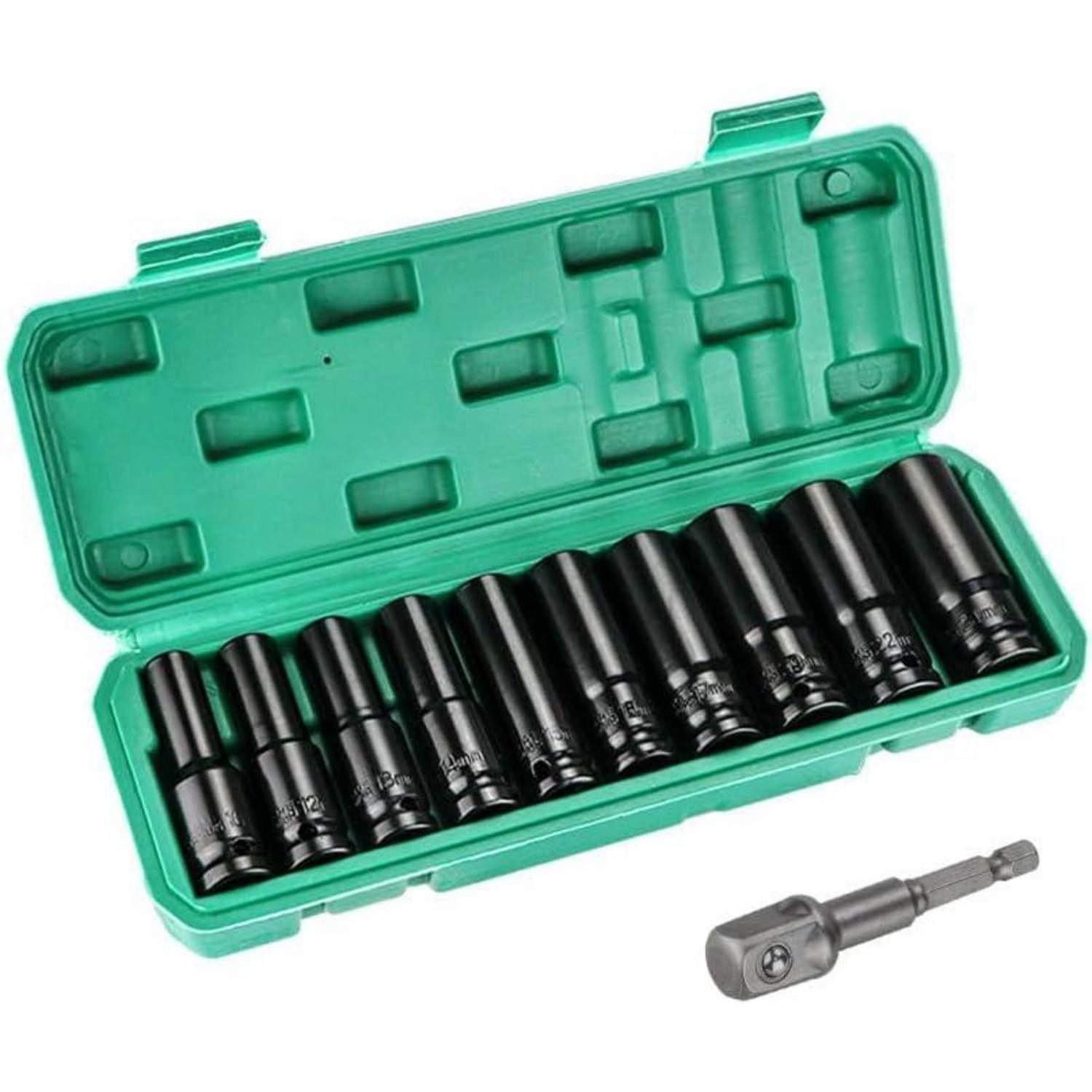 Die 1/2'' quadratische Schnittstelle passt zu gängigen Werkzeugen und die Nüsse bestehen aus Chrom-Vanadium-Stahl.