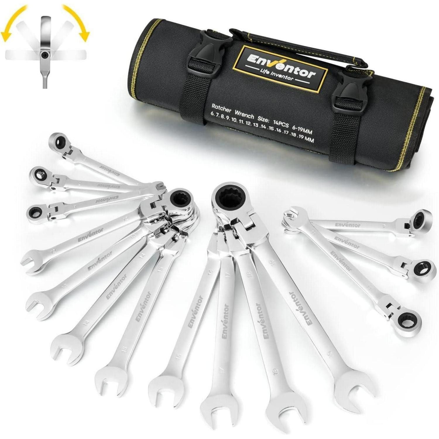 Stell dir vor: Du bist bereit, jede Schraube mit Präzision zu meistern. Dieses Enventor Schraubenschlüssel-Ratschenset, 14-teilig, 6-19 mm, vereint Ringmaul- und Gabelschlüssel in einem einzigen Set. Von der Heimwerkstatt bis zur Autoreparatur deckt es alle gängigen Größen ab – dank der 14 metrischen Größen von 6 bis 19 mm. Der 180° schwenkbare Kopf und das 72-Zähne-Ratschengetriebe ermöglichen mühelose Arbeiten selbst in engen Passagen, und du musst nur ca. 5° drehen, um die nächste Zahnposition zu erreichen. Die langlebige Chrom-Vanadium-Stahlkonstruktion mit spiegelpolierter Oberfläche sorgt für Härte und Korrosionsschutz, während die robuste Oxford-Tasche das Set sicher aufbewahrt und transportabel macht.