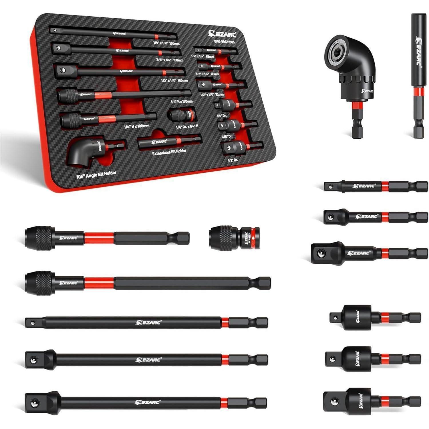 Dieses 14tlg Stecknuss Adapter Set bündelt 1/4", 3/8" und 1/2" Stecknüsse, Quick-Release Verlängerungen und 105° Winkelschrauber für reibungslosen Wechsel zwischen Akkuschrauber, Schlagschrauber und Bohrmaschine