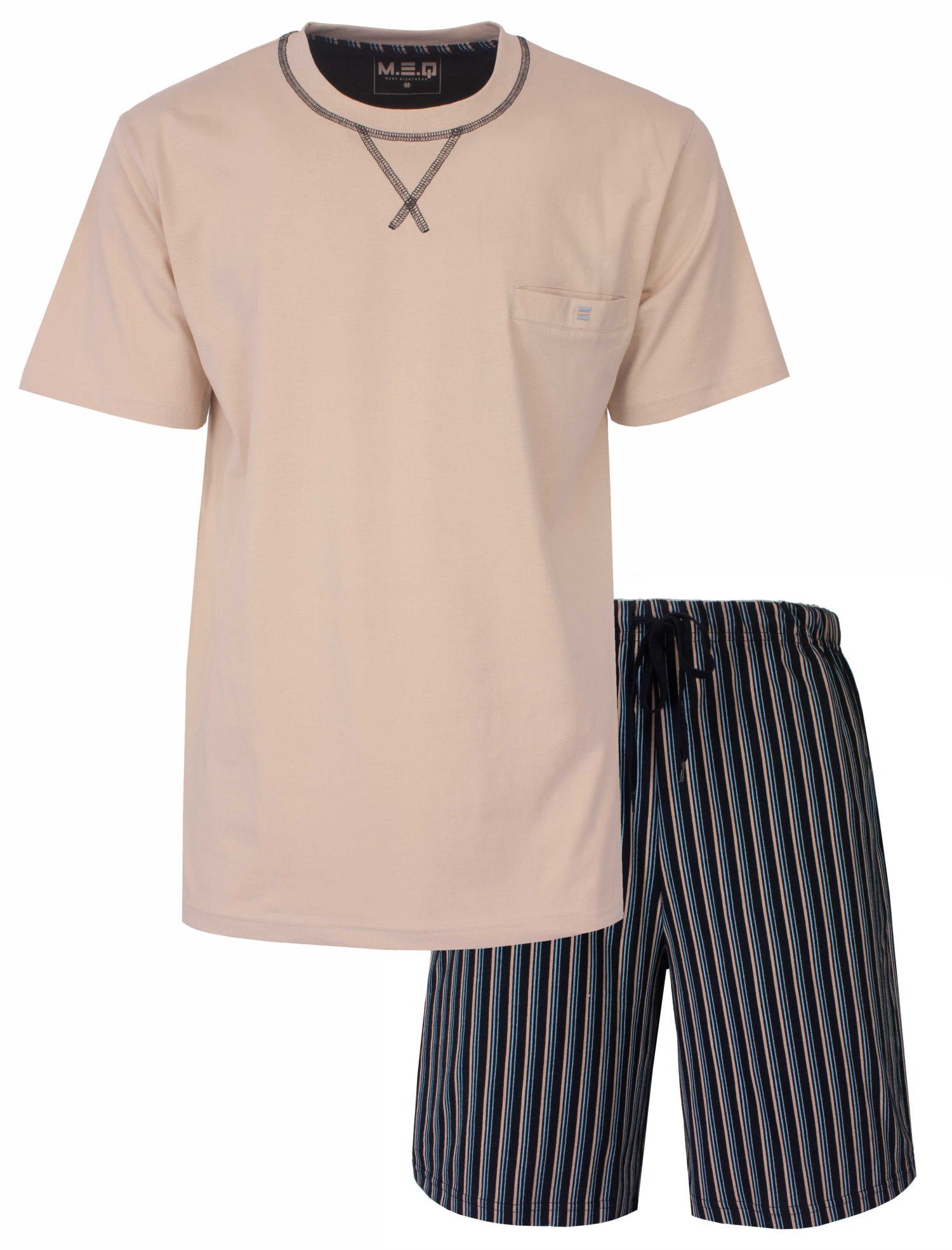 Dieser hochwertige M.E.Q. Herren-Schlafanzug Shorty vereint zeitlosen Stil und höchsten Tragekomfort. Gefertigt aus 100% reiner Baumwolle, bietet er ein angenehm weiches Hautgefühl und sorgt für eine optimale Atmungsaktivität. Das Oberteil ist mit einem klassischen Rundhals Ausschnitt gestaltet, der dem Shorty eine schlichte Eleganz verleiht. Die dazugehörige kurze Hose ist mit einem elastischen Gummizug ausgestattet, der eine bequeme Passform garantiert. Der zusätzliche Tunnelzug am Bund ermöglicht eine individuelle Anpassung, sodass der Schlafanzug stets angenehm sitzt, ohne einzuengen. Durch die hochwertige Baumwollverarbeitung ist der Schlafanzug nicht nur besonders hautfreundlich, sondern auch pflegeleicht und strapazierfähig. Mit seinem legeren, aber dennoch stilvollen Design ist dieser Herren-Schlafanzug Shorty die ideale Wahl für alle, die Wert auf Komfort und einen modernen Look legen. Ob für laue Sommernächte oder als gemütliche Freizeitbekleidung – dieser Shorty bietet das perfekte Zusammenspiel aus Funktionalität und Stil.