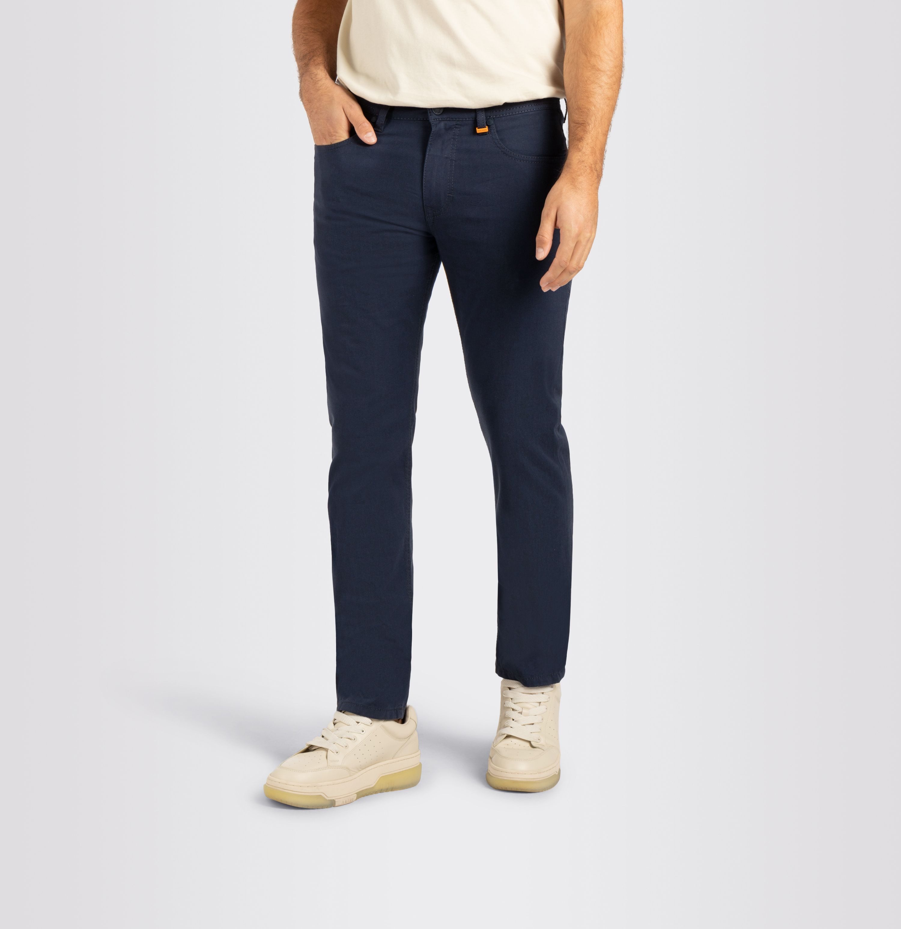 Modern Fit, gerades, schmales Bein, normale Leibhöhe, Five Pocket, Naht-Details auf den Gesäßtaschen, hochwertige Baumwoll-Structure-Stretch-Qualität, dreidimensional wirkende Wabenstruktur im Material, schnelltrocknende Eigenschaften, hervorragende Passform, angenehmer Griff, hoher Tragekomfort, über Better Cotton gesourcte Baumwolle, Das Model ist 1,85m groß und trägt die MAC Bundweite 33 und Länge 32, Fußweite bei Größe 33: 37cm