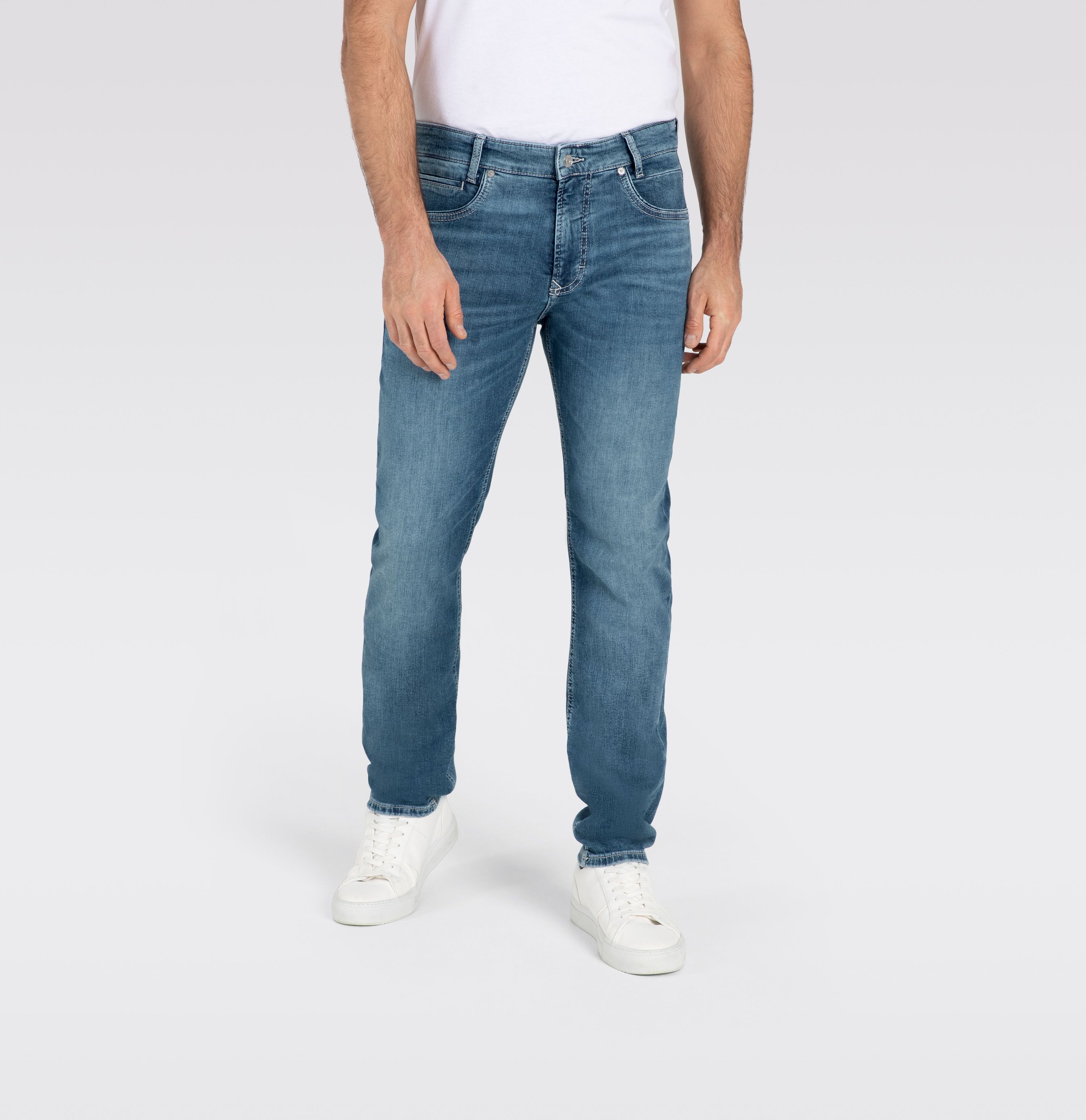 Modern Fit, gerades, schmales Bein, schmale Passform, gemäßigte, bequeme Leibhöhe, Five Pocket, moderne Naht-Details auf den Gesäßtaschen, Drivers Jeans, Stretch Denim mit sehr hoher Elastizität, hoher Tragekomfort, maximale Bewegungsfreiheit, ideal für lange Autofahrten geeignet, maskuline, kernige Optik, Vintage Look, hervorragendes Rücksprung-Verhalten, über Better Cotton gesourcte Baumwolle, Das Model ist 1,85m groß und trägt die MAC Bundweite 33 und Länge 32, Fußweite bei Größe 33: 37cm