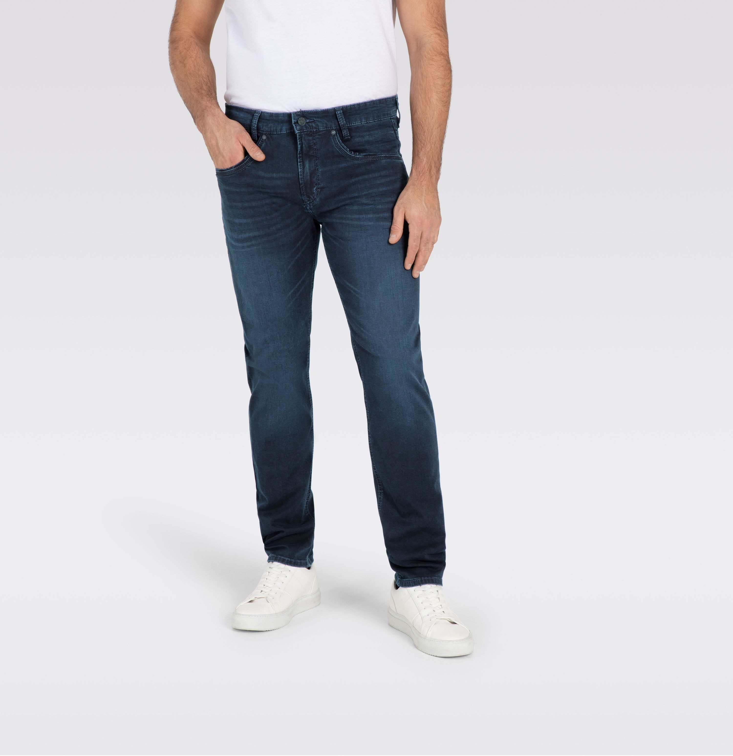 Modern Fit, gerades, schmales Bein, schmale Passform, gemäßigte, bequeme Leibhöhe, Five Pocket, Light Weight Denim, hohe Elastizität von etwa 40 Prozent, hoher Tragekomfort, sportive, authentische Optik, leicht im Gewicht, hervorragendes Rücksprung-Verhalten, über Better Cotton gesourcte Baumwolle, Das Model ist 1,85m groß und trägt die MAC Bundweite 33 und Länge 32, Fußweite bei Größe 33: 37cm