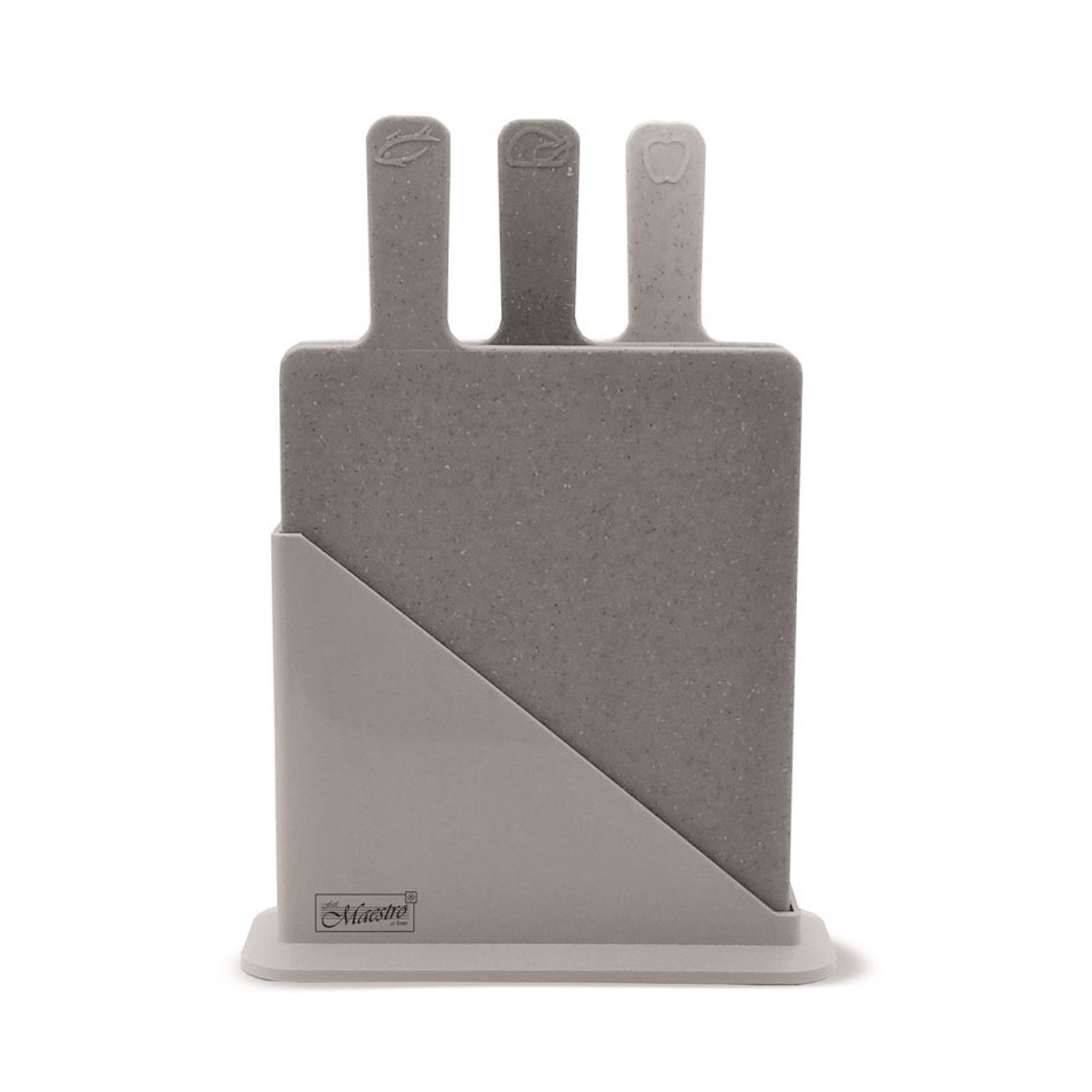 Ein Satz von drei rechteckigen, doppelseitigen Platten für verschiedene Arten von Produkten. Dies verhindert, dass geschnittene Lebensmittel den Geschmack anderer Lebensmittelprodukte übernehmen. Die Bretter bestehen aus Kunststoff. Jede Platte ist mit einer für einen bestimmten Produkttyp geeigneten Oberfläche ausgestattet, die das Schneiden und Portionieren erleichtert. Die Platten werden in einen stabilen Kunststoffständer gelegt. Dank dieser Bretter halten Sie Ihre Küche in Ordnung. Sie sind leicht zu warten und verursachen keine Probleme. Modernes Design verschönert Ihre Küche.