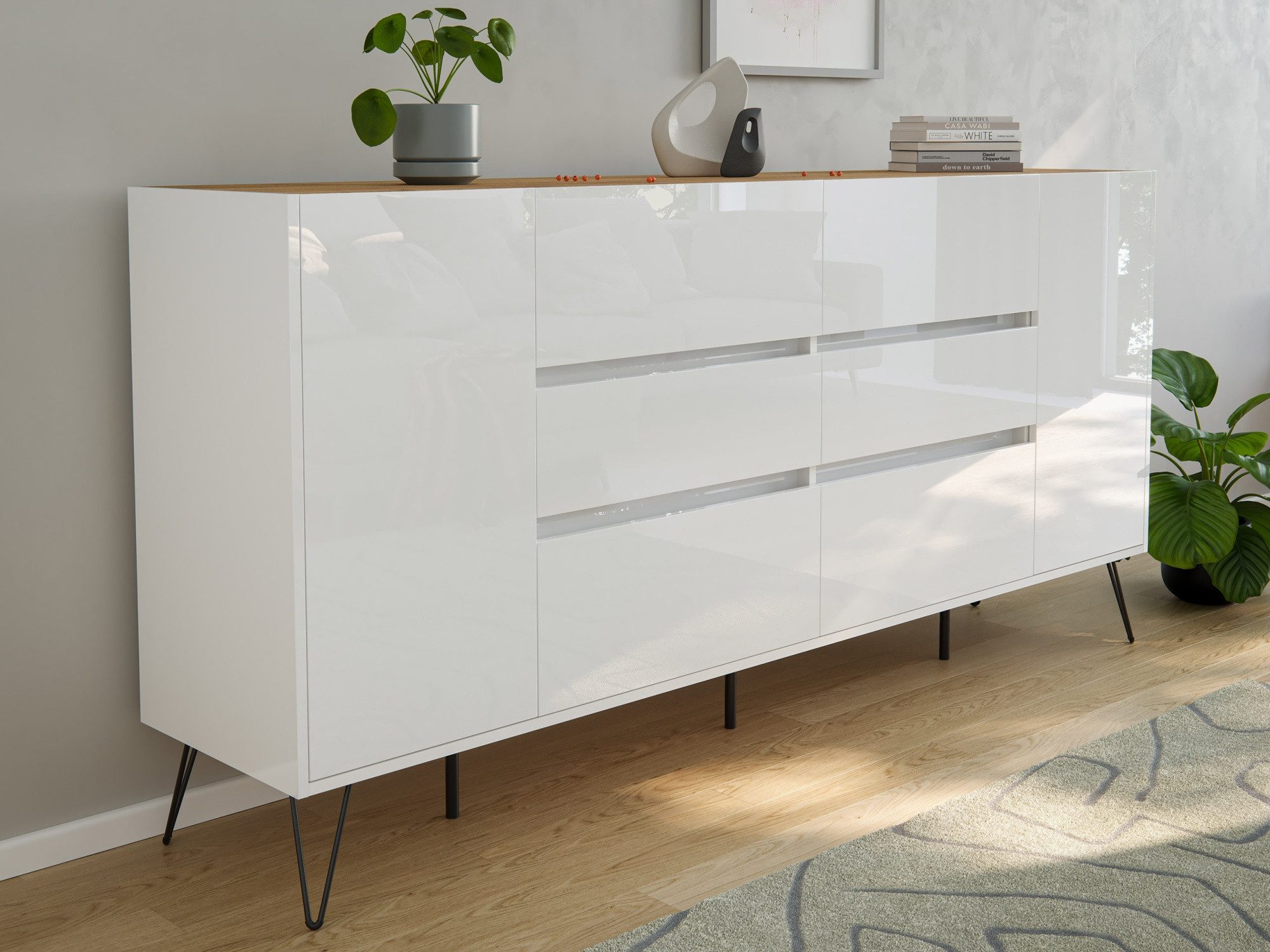Sideboard Kommode Yako stehend mit Industriefüßen 200cm mit 6 SoftClose Schubladen und 2 Türen (B/H/T) 199cm/97,1cm/42cm (Höhe Korpus 77,1cm, Höhe Füße 20cm)