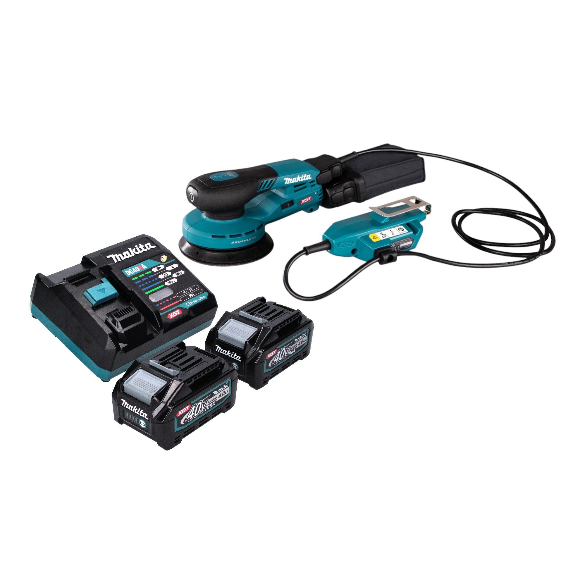 Der Makita BO001CG Exzenterschleifer besticht durch seine kompakte und leichte Bauweise, was ihn besonders handlich macht. Er kann wahlweise mit einem 40V max. Akku oder über den PDC-Connector betrieben werden. Die Energieversorgung erfolgt dabei über ein Adapterkabel, das den Akku separat verbindet, was die Möglichkeit bietet, den Akku beispielsweise am Gürtel zu tragen. Dies erhöht die Bewegungsfreiheit und Komfort beim Schleifen. Die Maschine ist mit einer sehr effektiven Staubabsaugung ausgestattet, die entweder Staub direkt durch die Grundplatte in eine integrierte Staubbox leitet oder eine externe Absaugung über das Auto-Start Wireless System (AWS) ermöglicht, das sich per Bluetooth mit einem Staubsauger verbinden kann. Diese Technologie sorgt für eine saubere Arbeitsumgebung und weniger Reinigungsaufwand nach der Nutzung. Dank der regelbaren Dreh- und Exzenterbewegung liefert der Schleifer exzellente Ergebnisse auf unterschiedlichsten Materialien. Die Konstantelektronik garantiert dabei, dass die Drehzahl auch unter Last konstant bleibt, was ein gleichmäßiges Schleifbild sicherstellt. Der bürstenlose Motor bietet neben einer wartungsfreien Langlebigkeit auch eine Motorbremse, die für zusätzliche Sicherheit und Kontrolle während des Betriebs sorgt.