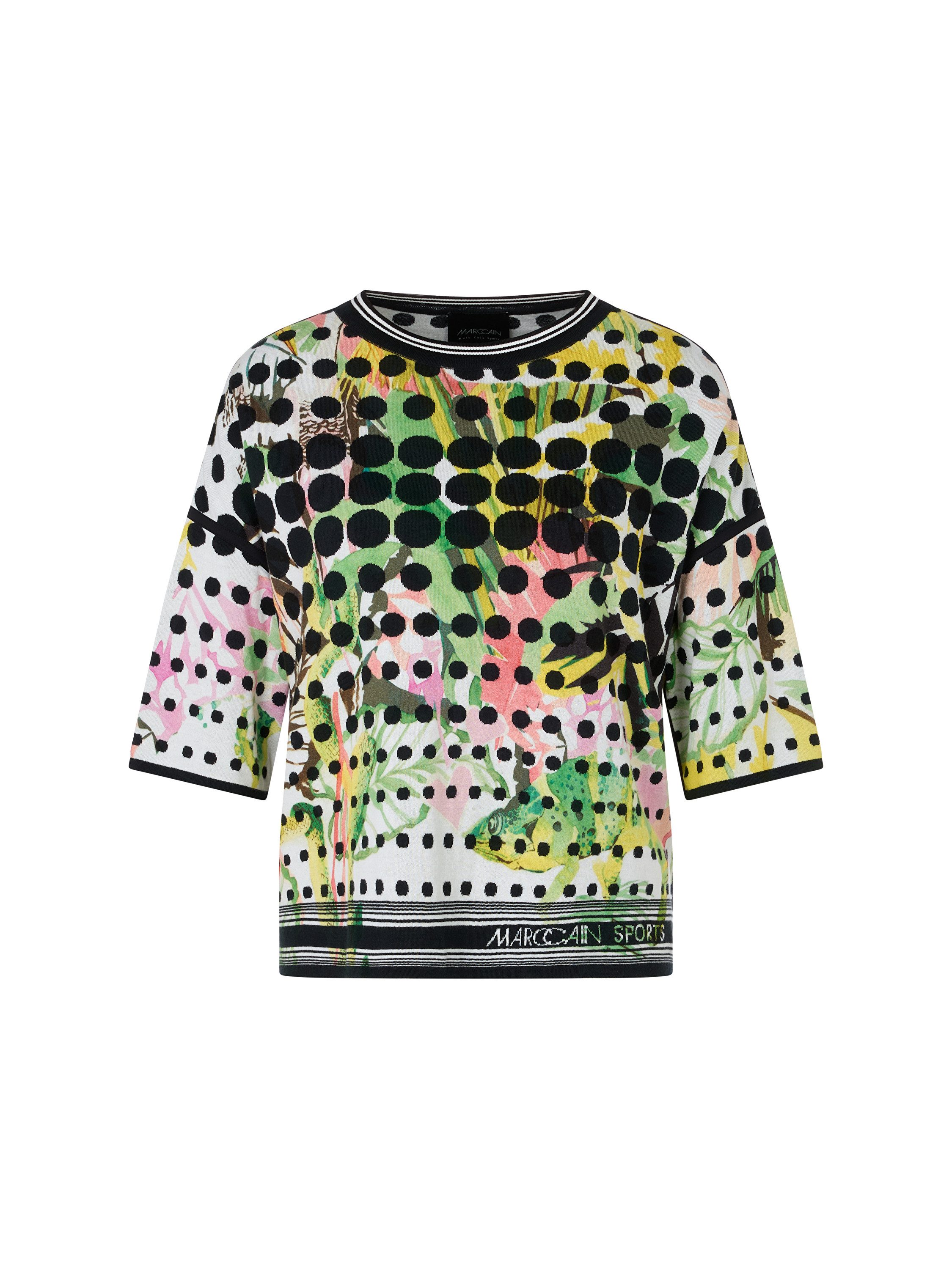 Sweater mit Kurzarm - Knitted in Germany|Oversized Feinstrick-Pullover mit überschnittenen Schultern. Cool, der Mustermix - die Front trägt ein farbenfrohes Dschungel-Motiv und der Rücken eine Computer-Graphik. Das Modell ist aus Bio-Baumwolle und Knitted in Germany. Es wird mit modernsten Technologien in Deutschland gestrickt und veredelt. Die einzelnen Teile - wie Rücken- und Vorderteil etc. - werden in europäischen Partnerbetrieben zusammengenäht.|Boxy Shape|Knitted in Germany|Kurzarm|Rundhals|Das Model ist 179 cm groß und trägt N3/38.