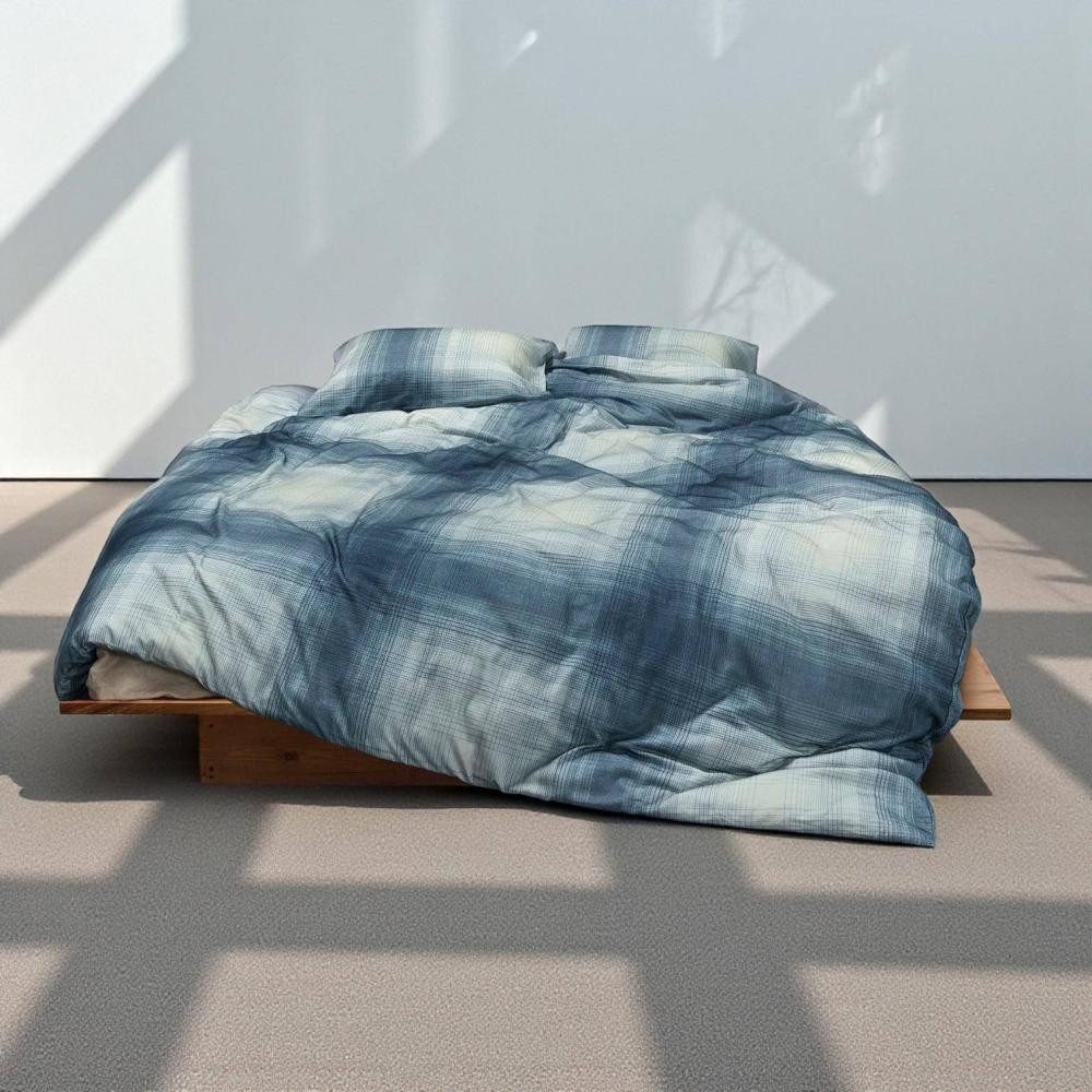 Das garngefärbte Schatten-Karo mit sanften Übergängen in Blau, Türkis und hellem Beige erinnert an den beruhigenden Farbverlauf eines winterlichen Himmels – ein zeitloses, stilvolles Design, das in jedes Schlafzimmer passt.