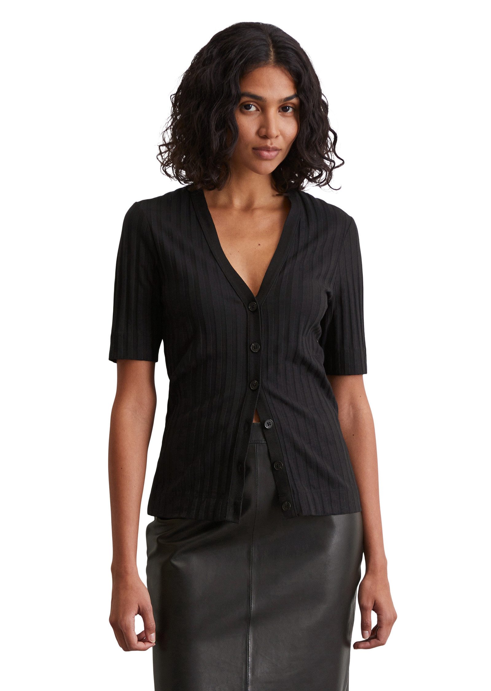 Stylisches Highlight: Der V-Neck-Cardigan mit lässigem See-through-Effekt ist aus einem soften Modal-Organic-Cotton-Mix im Pointelle-Jersey gefertigt, wobei "offene" Streifen für eine zarte, luftige Qualität sorgen. Die Strickjacke überzeugt durch ihre Vielseitigkeit — selbstbewusst zugeknöpft auf nackter Haut oder im Layering mit Tops, T-Shirts oder einem nudefarbenen Bandeau-Bra. Mit tiefem V-Ausschnitt, kurzen, schmalen Ärmeln und geradem Saumabschluss ist sie ein echter Hingucker. Perfekt ergänzt durch das passende Pointelle-Top, entsteht ein harmonischer Gesamtlook. Styling-Tipp: Kombinieren Sie ihn mit einem fließenden Faltenrock und Sneakers für einen modernen, entspannten Stil.