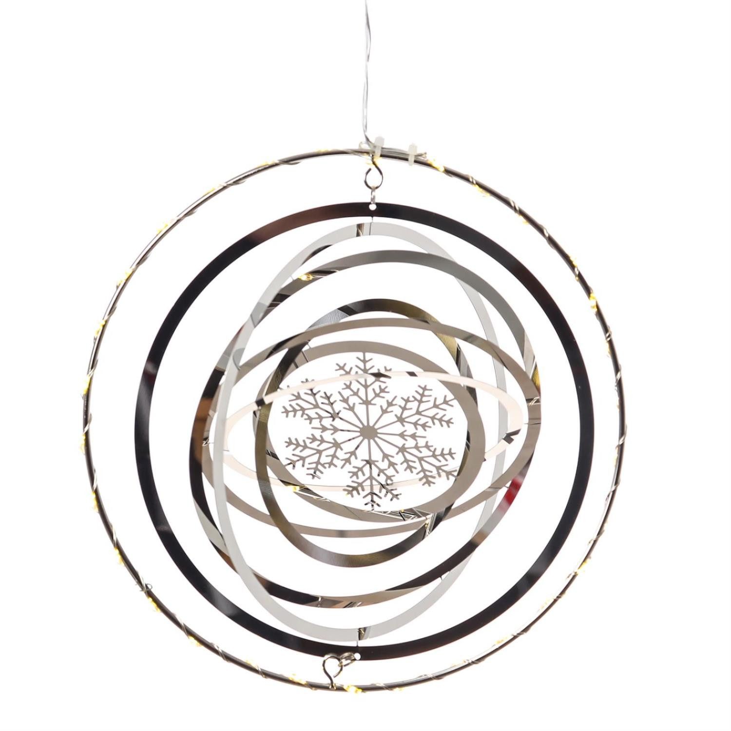 Es schimmert und funkelt, wenn sich das Licht in dieser 3D Schneeflocke reflektiert. Das Innere der Schneeflocke aus poliertem Edelstahlblech wird einmal in Form gebracht, indem die einzelnen Teile gedreht werden. Dann entfaltet sich der die Flocke und wird dreidimensional. Außen herum stützt ihn der silberfarbene Drahtkreis, um den eine Drahtlichterkette mit 30 warmweiß leuchtenden LED gewickelt ist.
