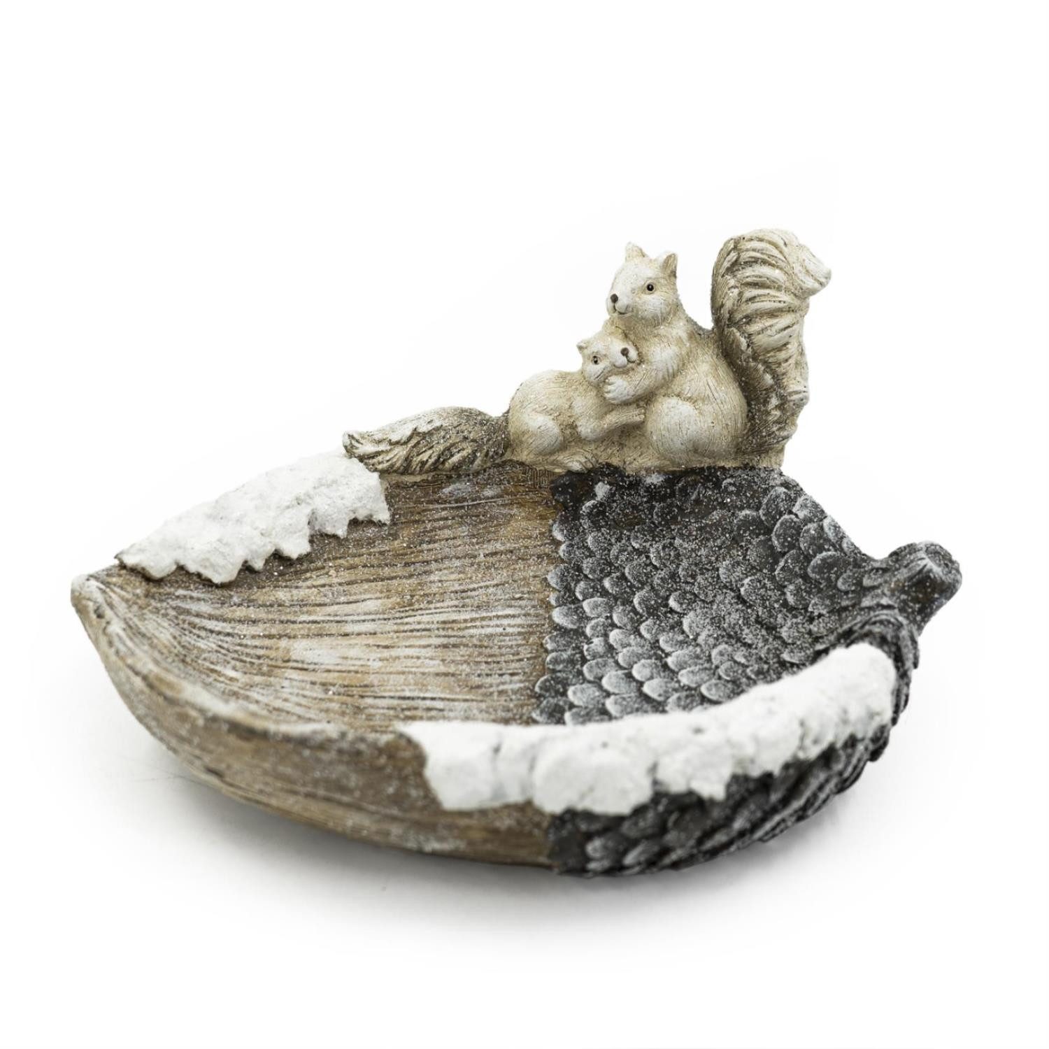 Dann ist diese tolle braune Futterstelle für Deinen Garten, Deinen Balkon oder Deine Terrasse genau richtig. Die zwei Eichhörnchen mit dem Kieferkegel in Schneeoptik sehen richtig süß aus.