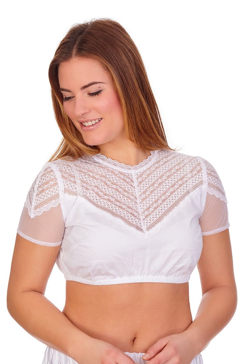 Die hinreißende Dirndlbluse Emilia-Carola im entzückenden Design aus der Glory Collection von der Marke MarJo zeigt sich bezaubernd süß und sexy. Sie ist hochgeschlossen mit Rundhals-Ausschnitt und hat kurze Ärmelchen. Der Ausschnitt schließt wellenförmig mit niedlicher Spitze ab und wird rückseitig mit einem Knopf und einer elastischen Knopfschlaufe geschlossen; darunter befindet sich ein kleiner Schlüsselloch-Ausschnitt. Die obere Partie besteht aus fantastischer, durchsichtiger Spitze im v-förmigen Streifen-Look mit floralen Motiven. Der Übergang der Spitze zu den Ärmeln ist fließend, die Bündchen am Ärmelabschluss sind gerade. Die untere Partie aus stretchigem, angenehmem Baumwollstoff hat vorn sowie hinten einen breiten V-Ausschnitt, bei dem die Spitze zart wellenförmig überlappt. Für einen perfekten Sitz sorgt der Gummizug im Saum. Diese Trachtenbluse lässt sich fabelhaft kombinieren.