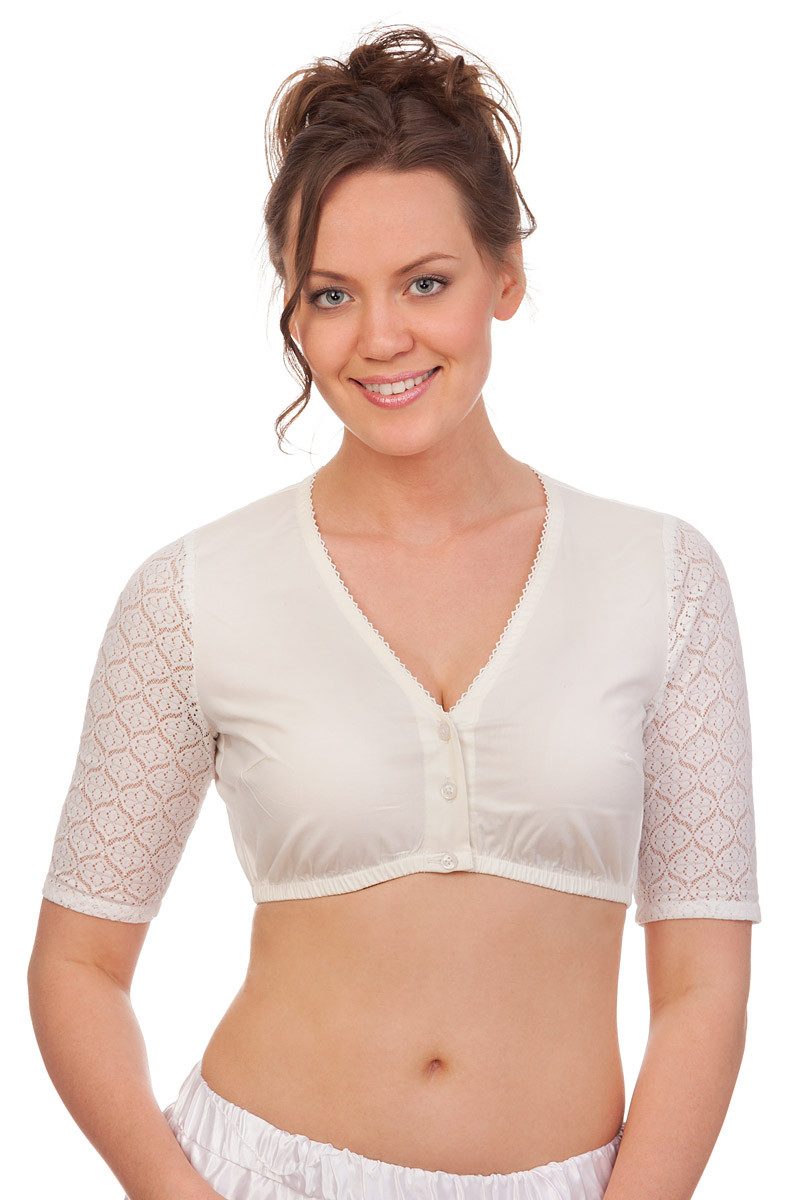 Die umwerfende Dirndlbluse Nalani-Bärbel, eine hinreißende Kreation aus der Grace Collection von MarJo, ist ein Wiesn-Schmankerl zum Schwärmen. Sie besteht vorn aus feiner Baumwolle mit Stretch-Anteil, der Rücken aus elastischem Shirt-Material und die halblangen Ärmel sind aus reiner, leicht elastischer Spitze mit exquisitem Blumen-Ornamentik-Muster gefertigt. Die Bündchen sind nicht elastisch. Den betörenden V-Ausschnitt ziert eine süße Häkelborte. Die Knopfleiste ist mit niedlichen Knöpfen mit Perlmutt-Schimmer bestückt. Für einen bequemen Sitz sorgt der elastische Saum. Bitte beachten Sie die Übergrößenzuschläge ab Größe 48.
