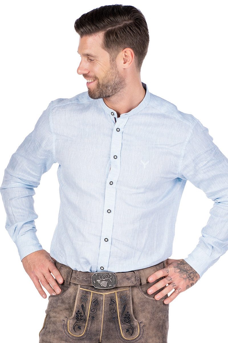 Dieses modische Trachtenhemd "Christian" mit langen Ärmeln und Stehkragen wird aus reinem, luftig-angenehmem Leinen in leicht transluzenter Stoffqualität gefertigt und besticht durch seine Chambray-Optik. Das feine, rustikal angehauchte Webmuster aus weißen und farbigen Fäden erzeugt einen raffinierten Frosted Effect. Der Stehkragen ist verstärkt und vorn mit einem Knopf versehen, die Knopfleiste mit einer dezenten Kontrast-Stoffborte verziert und die Knopflochleiste dezent abgesetzt. Die Knöpfe in stilisierter Hirschhorn-Optik ergänzen den traditionellen Look perfekt. Auf der linken Brust ziert eine kleine Hirschkopf-Stickerei das Trachten Herrenhemd. Die langen Ärmel enden mit verstärkten, geraden Manschetten sowie Ärmelschlitzen mit Knopf und der Saum ist abgerundet. Das stilvolle Hemd lässt sich sowohl zu einer Lederhose als auch zu Trachtenjeans hervorragend kombinieren. Beachten Sie bitte bei Größe 4XL den Größenzuschlag.