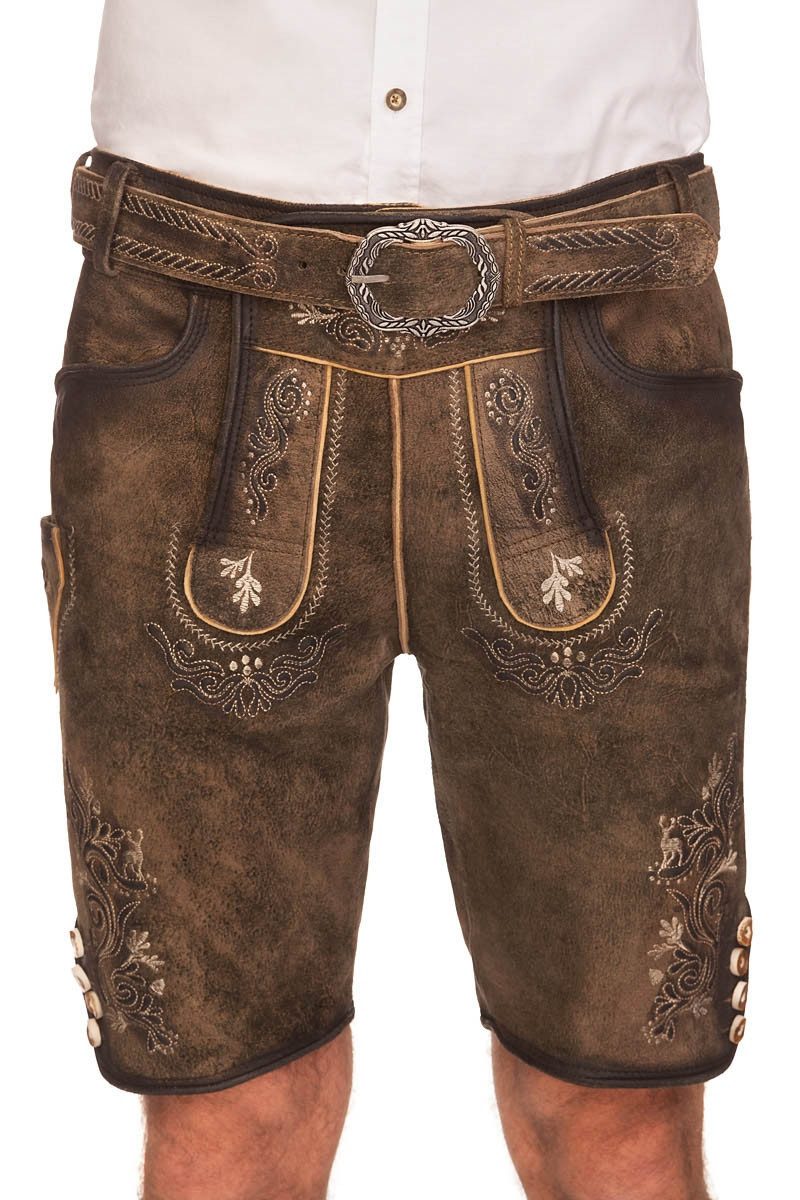 Die reich geschmückte Lederhose Anton aus weichem, robusten Ziegenvelourleder in geschwärzter Optik mit ihrer traditionellen, hochwertigen Hohlstickerei ist eine zünftige Rarität unter den Krachledernen. Die hangearbeiteten edlen Hohlstickereien befinden sich an den Beinen, Latz und Messertasche. Herrliche Ziernähte schmücken dazu die Hose an den Seiten und um den Latz, verfeinert noch mit wundervollen Stickereien mit Hirsch, Eichel- und Pflanzenmotiven. Die Messertasche auf der rechten Seite besitzt feines Keder umlaufend. Vorn und hinten ist die Ledershort auf Spalt und an den Seiten ist sie ebenfalls fesch auf Keder genäht. Beidseitig vorn besitzt sie Eingrifftaschen und eine Tasche hinten rechts. Am Beinabschluss wird sie geknöpft. Die Knöpfe bestehten natürlich aus zünftigen, echten Hirschhorn. Die Schnürung hinten am Bund sorgt für einen perfekten Sitz. Ein schicker Gürtel mit altsilberner Schnalle und feiner Hohlstickerei rundet das wundervolle Design vom namenhaften Trachtenhaus Marjo herrlich ab.