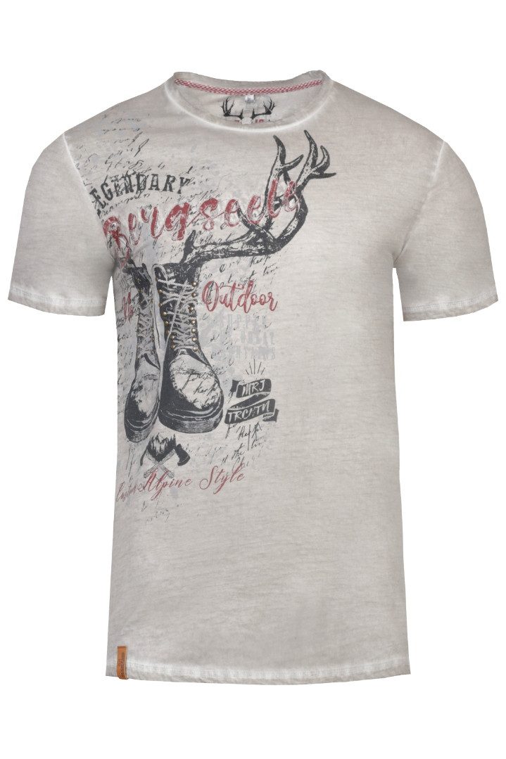 Das stylische kurzarm Herren Trachtenshirt Laurin in Schlamm, wird aus reiner, angenehmer Baumwolle in Jersey-Qualität gefertigt und hat allover einen angesagten Oil-Washed-Style mit feinen Bleach-Akzenten. Der Rundhals-Ausschnitt ist dezent abgesetzt und hat innenseitig hinten eine Karostoff-Borte als Besatz. Für den Blickfang sorgt oben rechts auf der Vorderseite der herrliche, große Wanderschuh-Print mit Geweih in Schwarz im gezeichneten Stil mit kernig gestickten Schnürsenkeln und messingfarbenen Flachnieten als Ösen. In Geweih-Höhe befindet sich der gedruckte Schriftzug "Bergseele" in Dunkelrot und die Kontur ist umstickt. Komplett wird das Motiv durch Schriftzüge in verschiedenen Schriftarten und Farben, durch den kleinen Banner unten rechts mit dem Marken-Kürzel, durch die aufgedruckten, gekreuzten Äxte mit einem Berg und Wald in Miniatur mittig unten sowie die Textteile in Handschrift in Schwarz und dezente, hellgraue Sprenkel im Hintergrund. Das fantastische Herrenshirt lässt sich fetzig zu Lederhose und Trachtenjeans kombinieren.