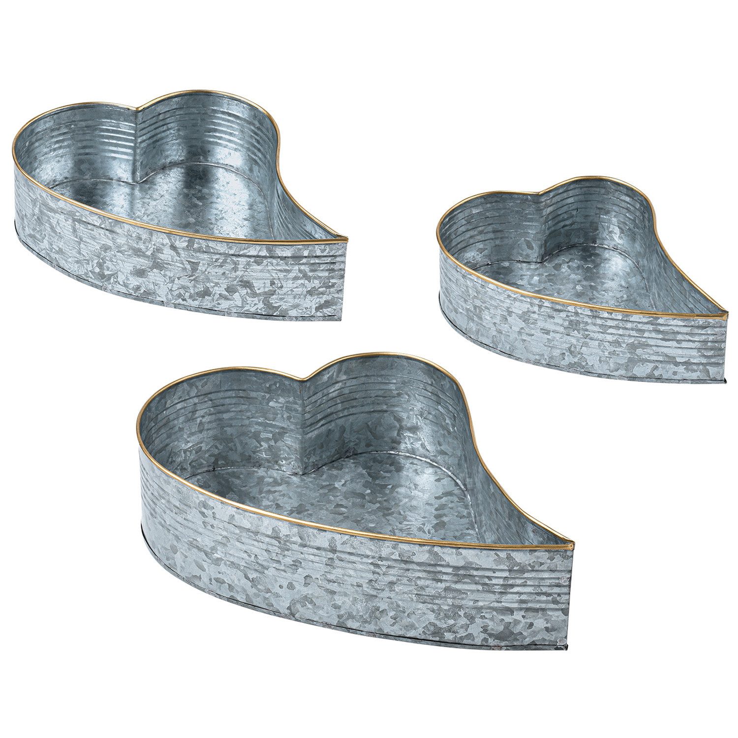 3er Set Serviertabletts Valentin Verleihen Sie Ihrem Zuhause eine rustikale und festliche Atmosphäre mit diesem 3er Set Metall-Serviertabletts in Herzform. Hergestellt aus robustem galvanisiertem Metall in silberfarbenem Vintage-Look, sind diese Tabletts perfekt für den Bauernhausstil geeignet. Sie können sie als Serviertabletts für Snacks und Getränke verwenden oder als Kerzenteller für eine stimmungsvolle Weihnachtsdekoration. Das charmante Herz-Design verleiht jedem Raum einen Hauch von Weihnachtszauber. Das Set enthält drei verschiedene Größen, so dass Sie sie vielseitig einsetzen und nach Belieben platzieren können. Machen Sie sich selbst eine Freude oder verschenken Sie dieses stilvolle und praktische Set als ideales Weihnachtsgeschenk im Bauernhausstil. . • Lieferumfang: 3x Metalltabletts im Retro Still | Größe Tablett groß: 31cm lang 22cm breit und 8cm hoch | Größe Tablett mittel: 25cm lang 19cm breit und 7cm hoch | Größe Tablett klein: 20cm lang 15cm breit und 6cm hoch • Material: verzinktes galvanisiertes Metall | Farbe: Silber Zink-Farbe
