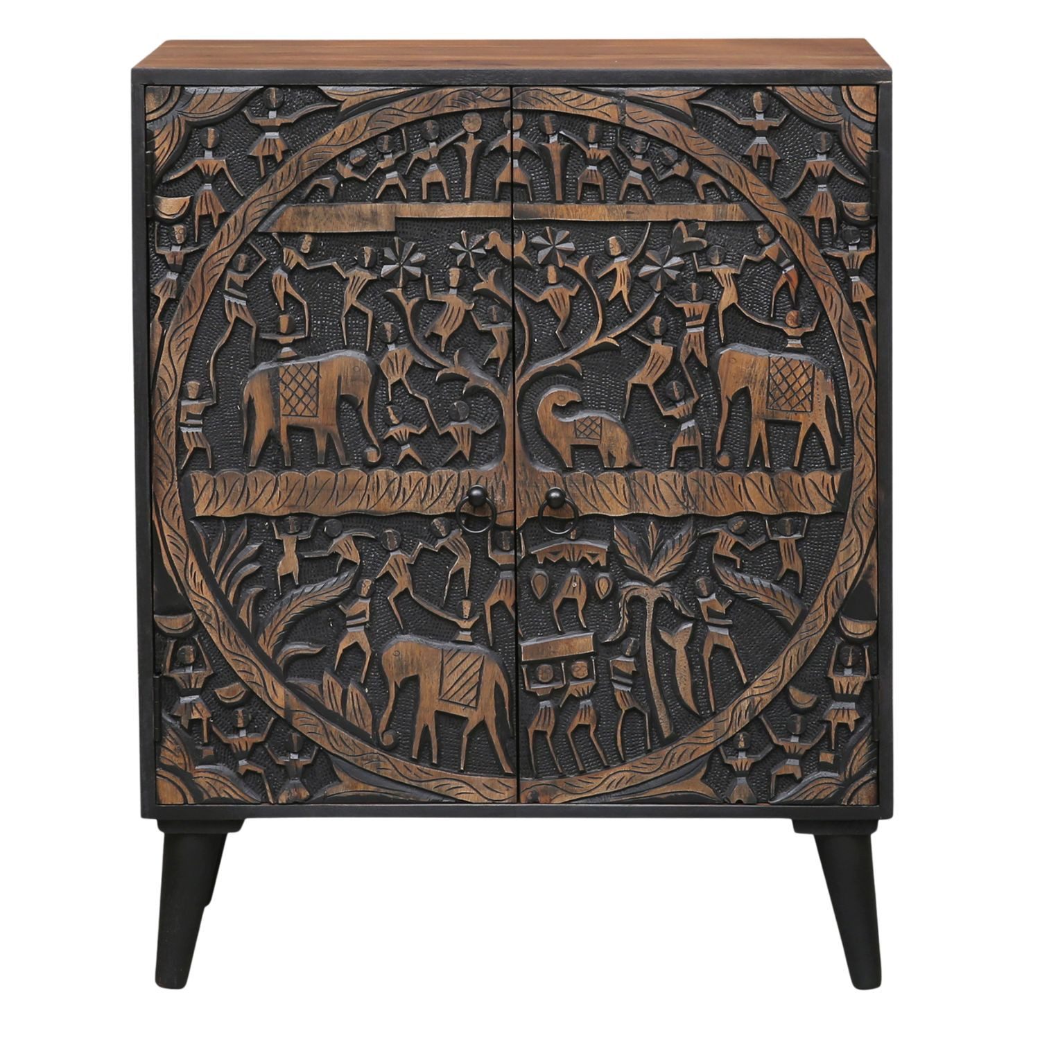 Die Kommode Abiola ist ein außergewöhnliches Möbelstück aus massivem Mangoholz. Ihre kunstvoll von Hand geschnitzte Front zeigt traditionelle indische Motive wie Elefanten und Naturdarstellungen und macht jede Kommode zu einem einzigartigen Kunstwerk. Das dunkle Holz kombiniert mit den detailreichen Ornamenten sorgt für eine warme, ausdrucksstarke Ausstrahlung.