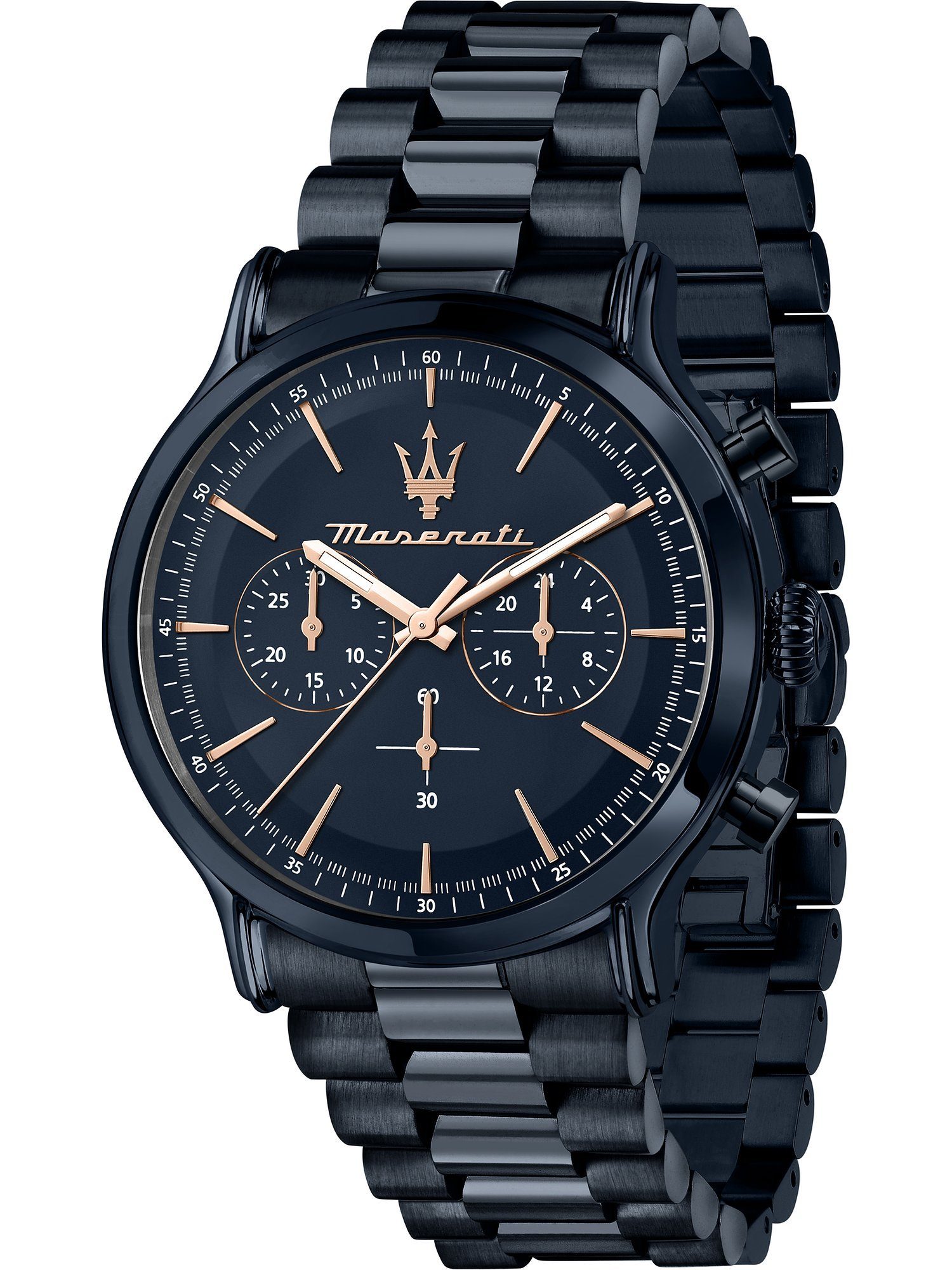 Im edlen All-Blue-Look trifft der MASERATI Chronograph Epoca MET aus Edelstahl auf. Sowohl das Gliederarmband - in teils polierter und teils mattierter Optik - als auch das Gehäuse, die Drücker und das Ziffernblatt mit Sonnenschliff sind in einem tiefen und noblen Dunkelblau gehalten. Für beste Ablesbarkeit und spannende Kontraste sorgen die roségoldfarbenen Zeiger, Indizes und Markierungen. Doch die Herrenuhr ist nicht nur optisch ein echtes Highlight, sondern besticht auch durch technische Raffinesse. Auch das hochwertige Quarzuhrwerk von Miyota ist ein Grund, sich für diese besondere Uhr zu entscheiden.