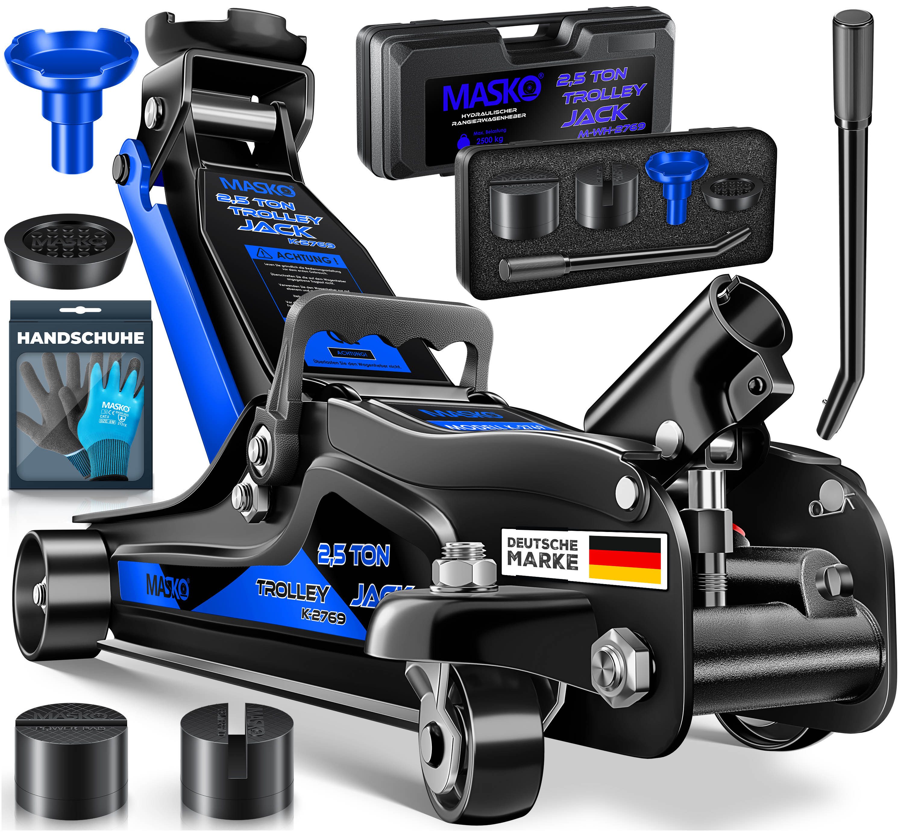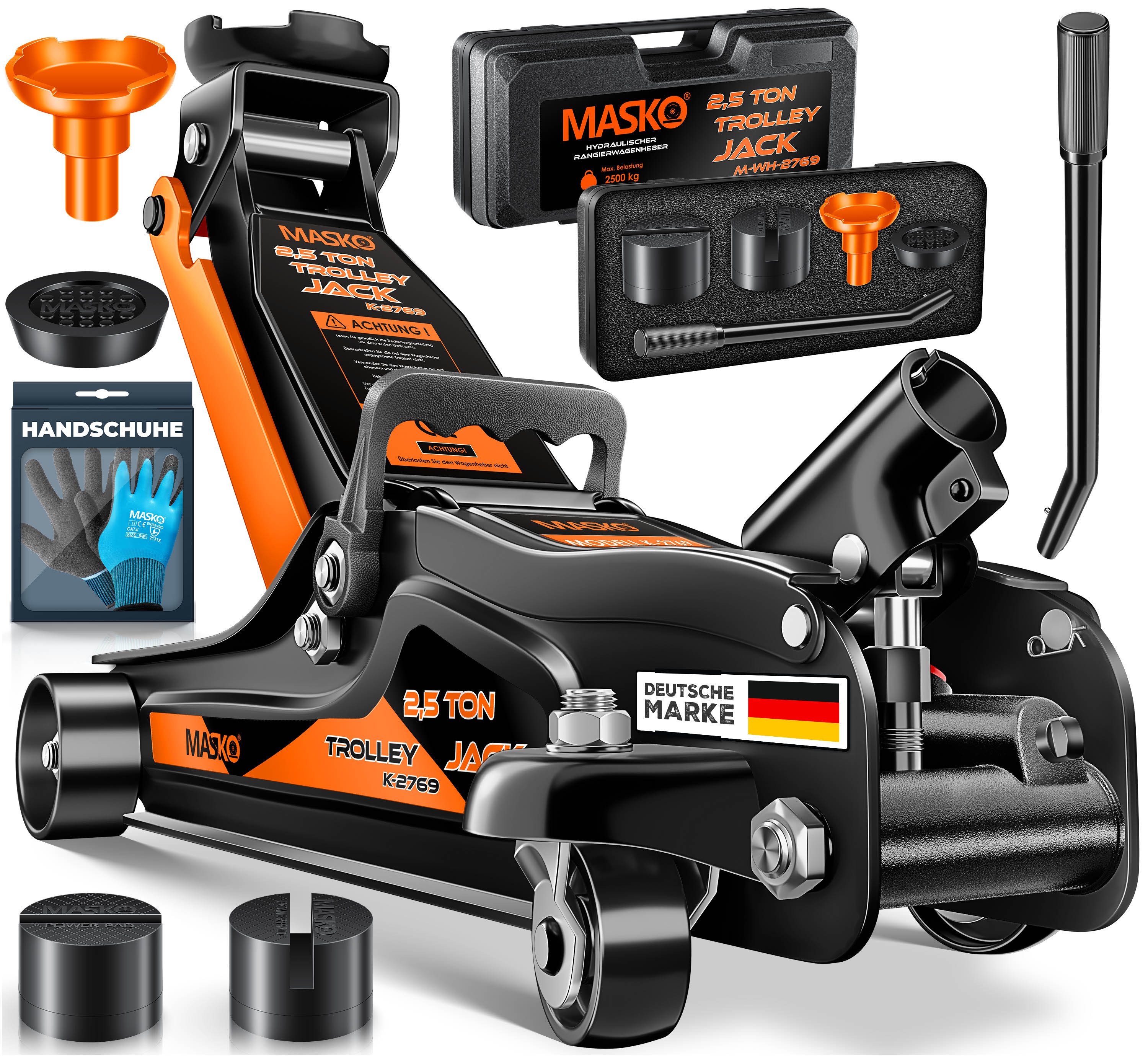 MASKO Wagenheber mit leistungsstarker Hydraulik und robuster Konstruktion, mit einer extra langen Hebestange und drei Gummiauflagen, leicht zu transportieren dank PVC-Handgriff und Koffer zum verstauen, inkl. Montagehandschuhe